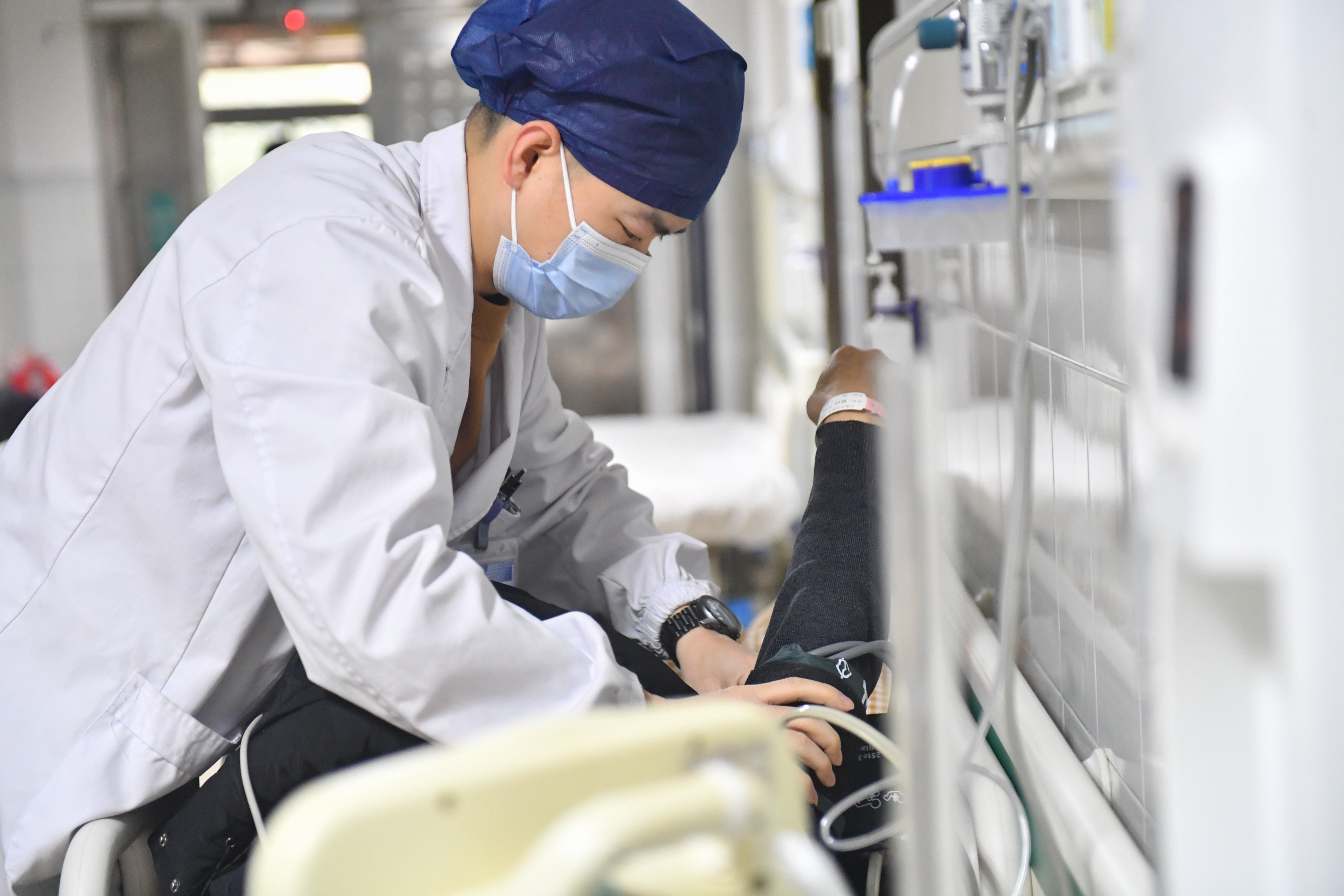 新华社照片,长沙,2022年2月14日 “90后”男护士朱浩华:急救室里“守护团圆” 在中南大学湘雅三医院急诊抢救室,朱浩华为病人做紧急情况处理(2月12日摄)。 询问病人情况、为病人做紧急情况处理、检查各类器械是否正常工作、安抚病人和病人家属情绪……男护士朱浩华有条不紊地展开一天的工作。 1992年出生的朱浩华,曾跟随医疗队前往武汉抗击新冠肺炎疫情,目前在中南大学湘雅三医院的急诊抢救室工作。“急诊抢救室是一个时间紧、任务重的科室,平均一天要接收20到30个病人,部分病人可能会有生命危险。”朱浩华说,每位病人身后都有一个家庭,不管多忙、多紧张,都要做到工作细致入微、忙而不乱,努力救治病人、守护他们家庭的团圆。 新华社记者 陈泽国 摄