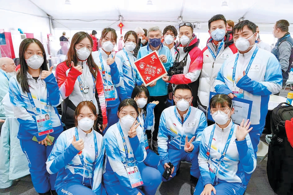巴赫主席与志愿者们交流,志愿者们向他赠予冬奥剪纸。