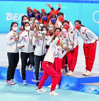 2月13日,北京2022年冬奥会短道速滑项目女子3000米接力决赛中,中国队获得季军。图为冠军亚军季军选手在颁发纪念品仪式上手握冰墩墩合照自拍。光明日报记者 郭红松摄/光明图片