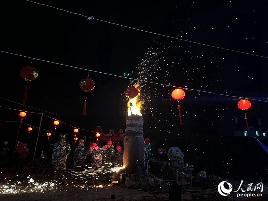 “这项传统技艺表演的形成与旧时村民多以打铁铸鼎为业息息相关。”锦墩村壶山砂花技艺传承人陈银洪介绍,由于铸鼎时飞溅的铁砂火花十分美观,艺人们因此产生灵感,发明了独特的“壶山砂花”。此后,这一技艺被运用到元宵传统节日的庆祝仪式中,代代相传至今。