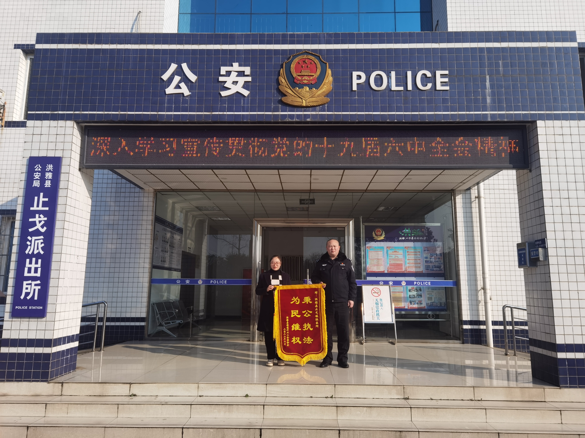 2月11日,洪雅县快递行业工会联合会的一名群众代表将一面书有“秉公执法,为民维权”的锦旗送到洪雅县公安局止戈派出所,感谢派出所民辅警积极协调、快速破获系列快递包裹被盗案,及时为邮政、京东等5家快递公司挽回经济损失。
