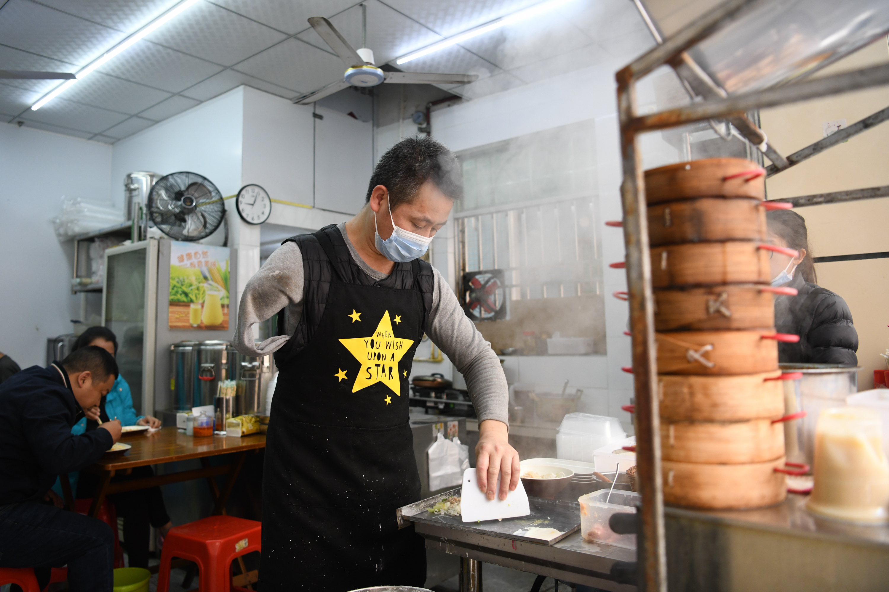 新华社照片,深圳(广东),2022年2月14日 心安之处便是“家”——深圳水尾村见闻 2月12日,在深圳市龙华区民治街道水尾村左撇子肠粉店,陈用发在制作肠粉。 (配本社同题文字稿) 新华社记者 梁旭 摄
