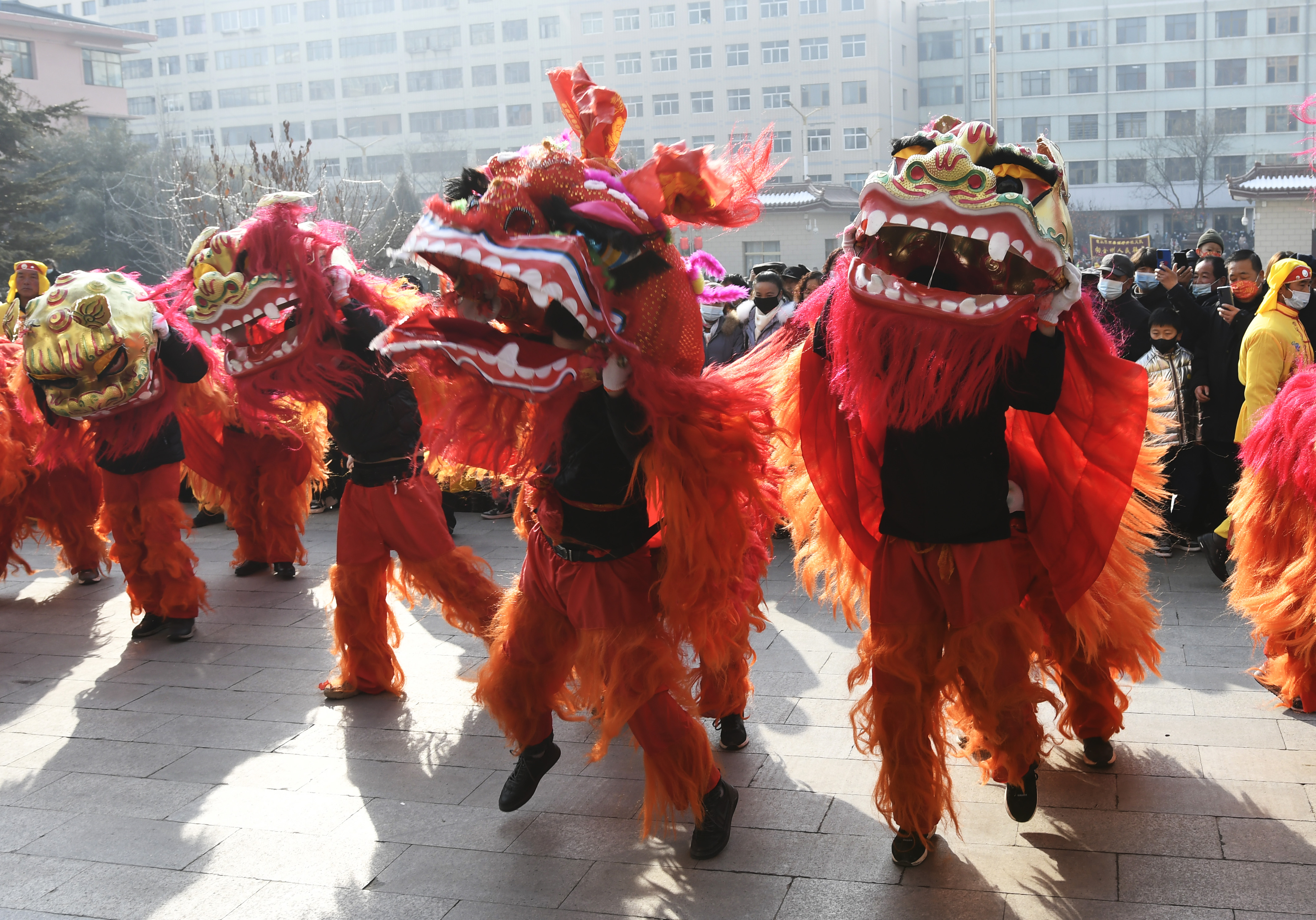 新华社照片,临夏(甘肃),2022年2月14日 龙狮欢腾迎元宵 2月14日,在临夏回族自治州临夏市,乡村社火队表演民俗节目。 元宵佳节将至,甘肃省临夏回族自治州的乡村文化生活日益精彩活跃,龙狮欢腾,秧歌社火,村民们利用民俗文化尽情展现乡村振兴新风貌,欢庆元宵佳节。 新华社发(史有东 摄)