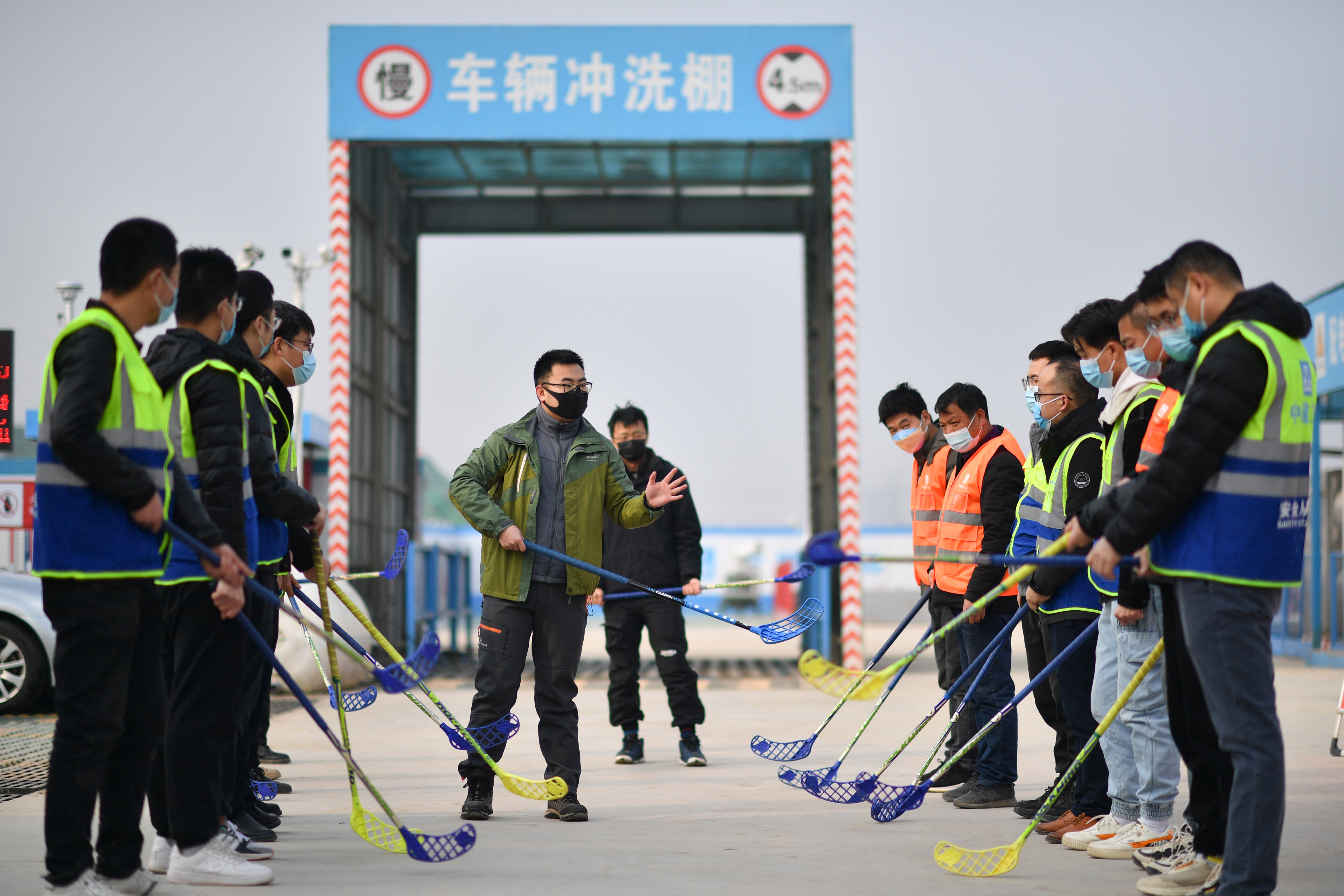新华社照片,西安,2022年2月14日 工地“冬奥会” 欢乐庆元宵 2月14日,在西安市航天基地智能制造产业园建设项目工地,工作人员(中)为中建三局西北公司工人与项目管理人员讲解旱地冰球规则。 元宵佳节将至,一场工地“冬奥会”在中建三局西北公司西安市航天基地智能制造产业园项目工地举行。工作人员准备了冬奥会主题灯谜、旱地冰壶、旱地冰球等项目,邀请一线建设者感受冰雪运动魅力,欢庆元宵佳节。 新华社记者 张博文 摄