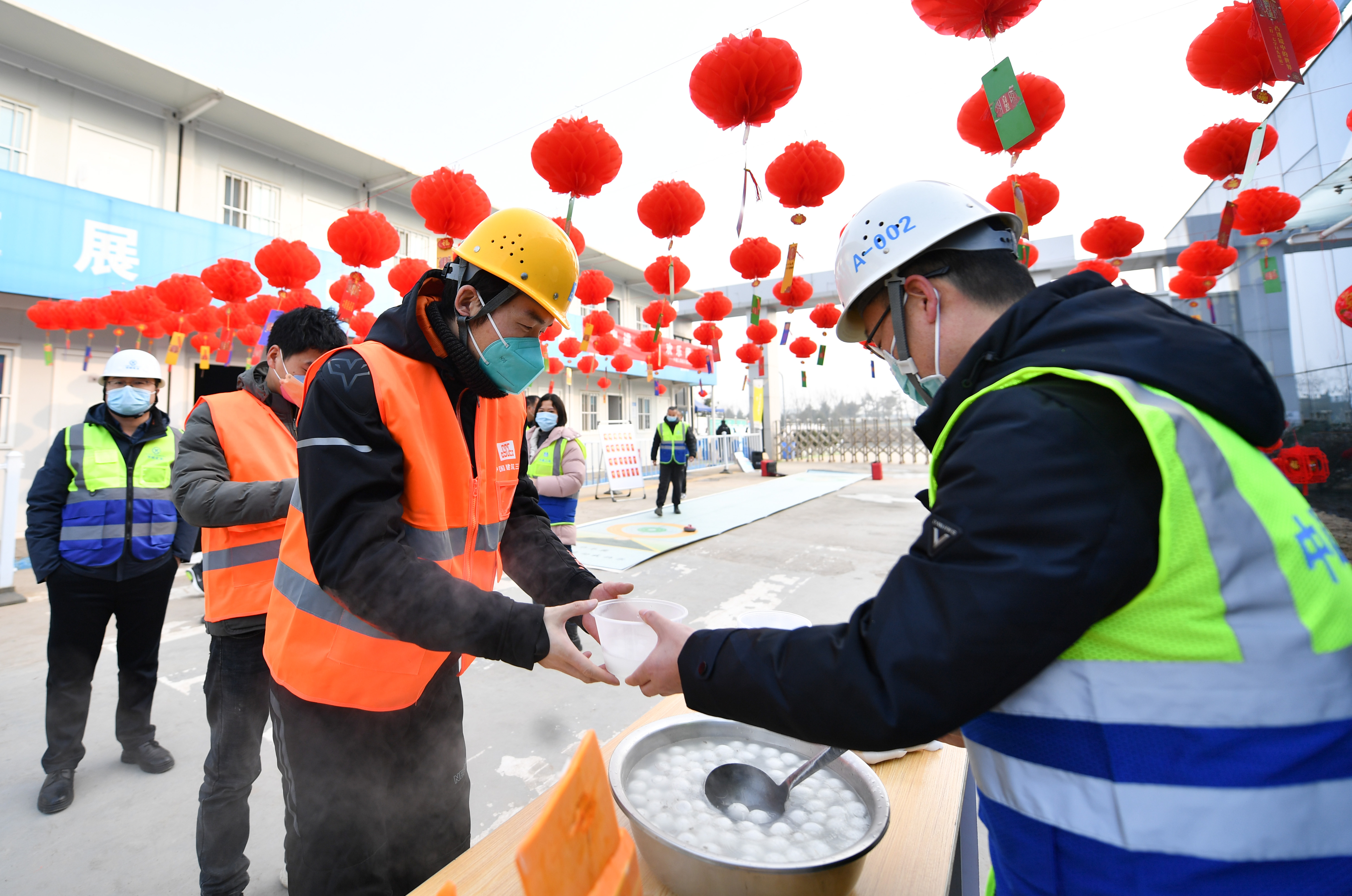 新华社照片,西安,2022年2月14日 工地“冬奥会” 欢乐庆元宵 2月14日,在西安市航天基地智能制造产业园建设项目工地,中建三局西北公司项目管理人员为工友送上元宵。 元宵佳节将至,一场工地“冬奥会”在中建三局西北公司西安市航天基地智能制造产业园项目工地举行。工作人员准备了冬奥会主题灯谜、旱地冰壶、旱地冰球等项目,邀请一线建设者感受冰雪运动魅力,欢庆元宵佳节。 新华社记者 张博文 摄