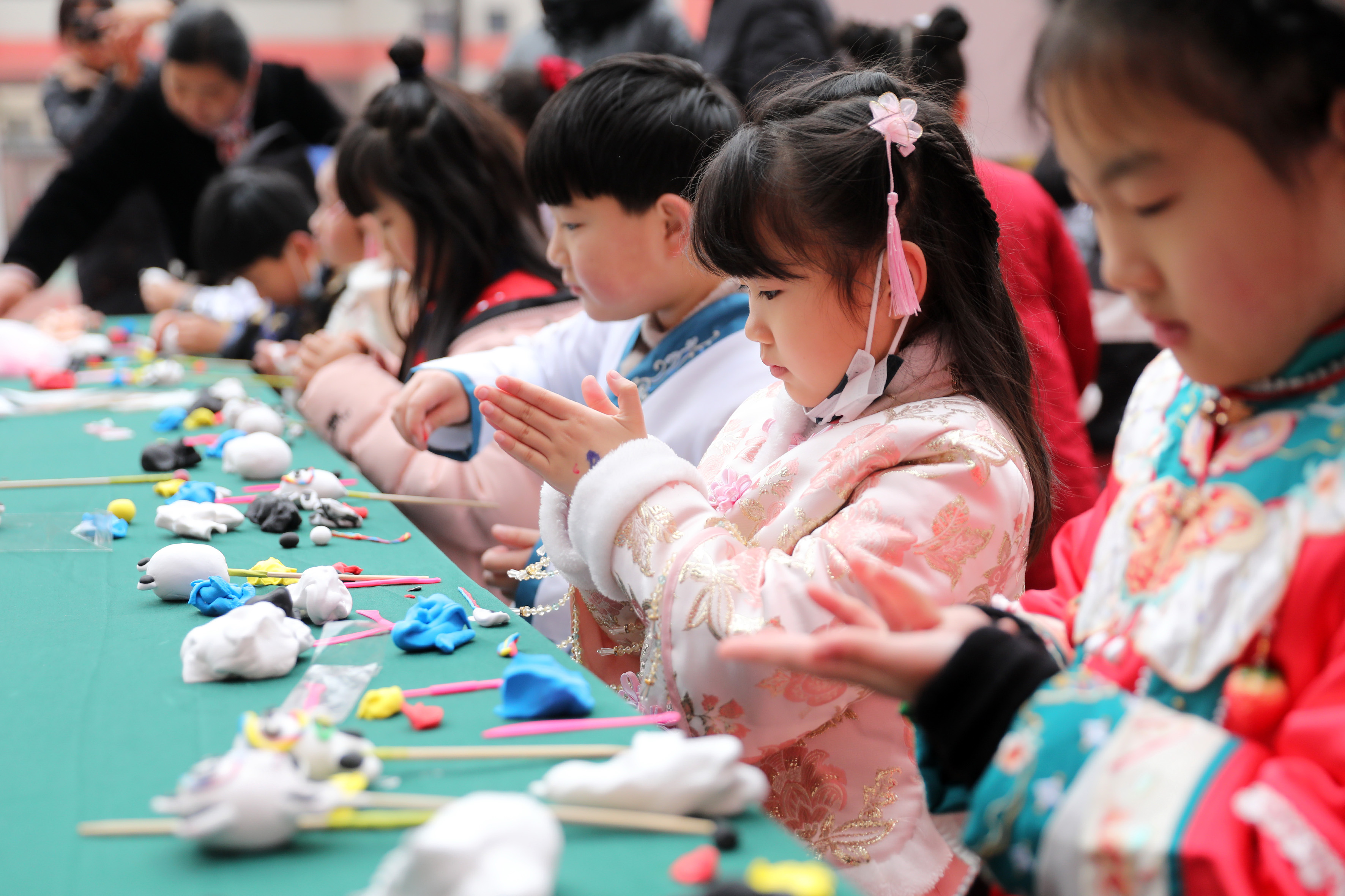 新华社照片,淮北(安徽),2022年2月14日 热热闹闹迎元宵 2月14日,在安徽省淮北市第三实验小学,学生们在学习捏面塑。 元宵佳节将至,各地群众通过丰富多彩的活动热热闹闹迎元宵。 新华社发(万善朝 摄)