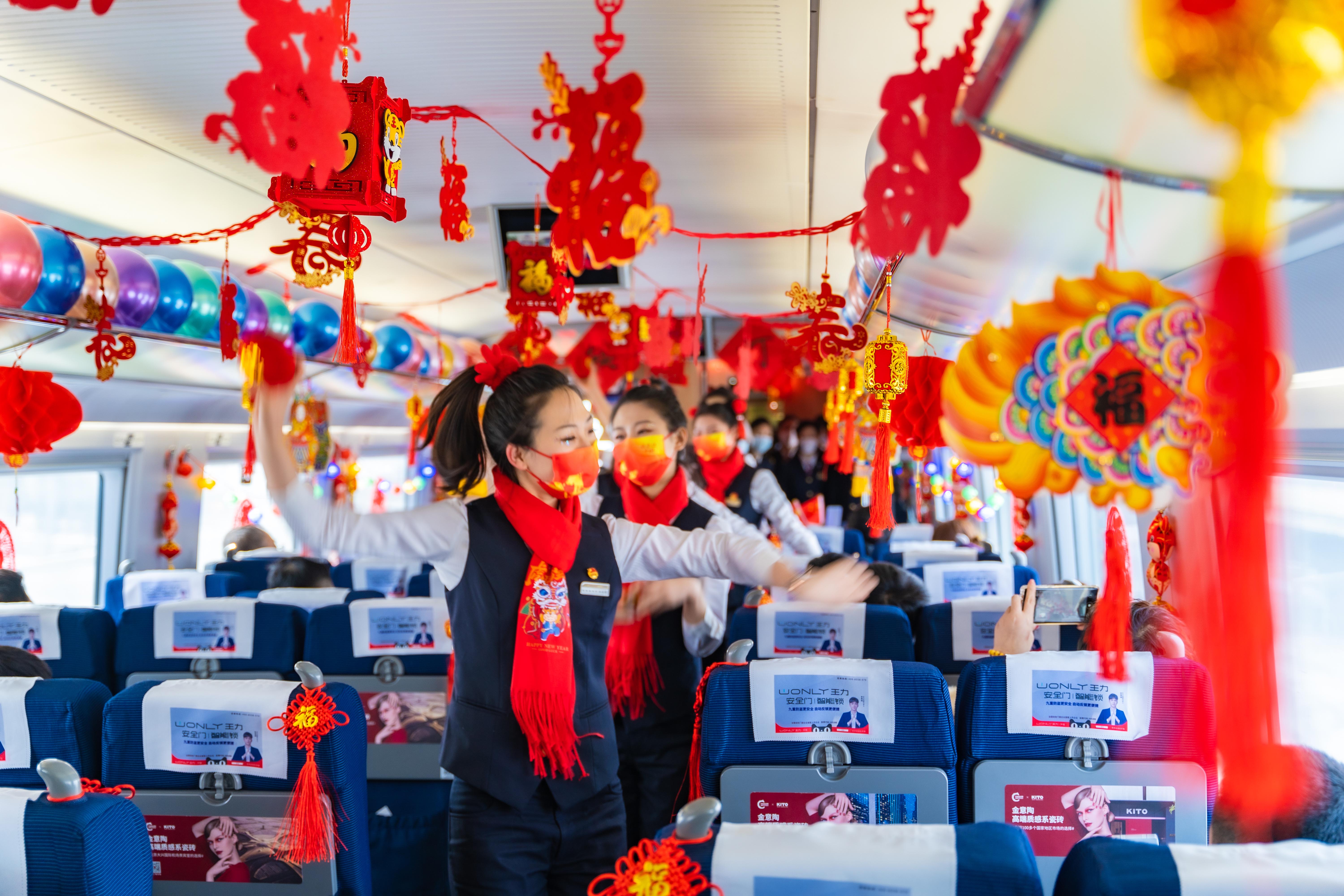 新华社照片,沈阳,2022年2月14日 热热闹闹迎元宵 2月14日,在G8039次列车上,中国铁路沈阳局集团有限公司沈阳客运段职工为旅客表演节目。 元宵佳节将至,各地群众通过丰富多彩的活动热热闹闹迎元宵。 新华社发(韩庆潇 摄)