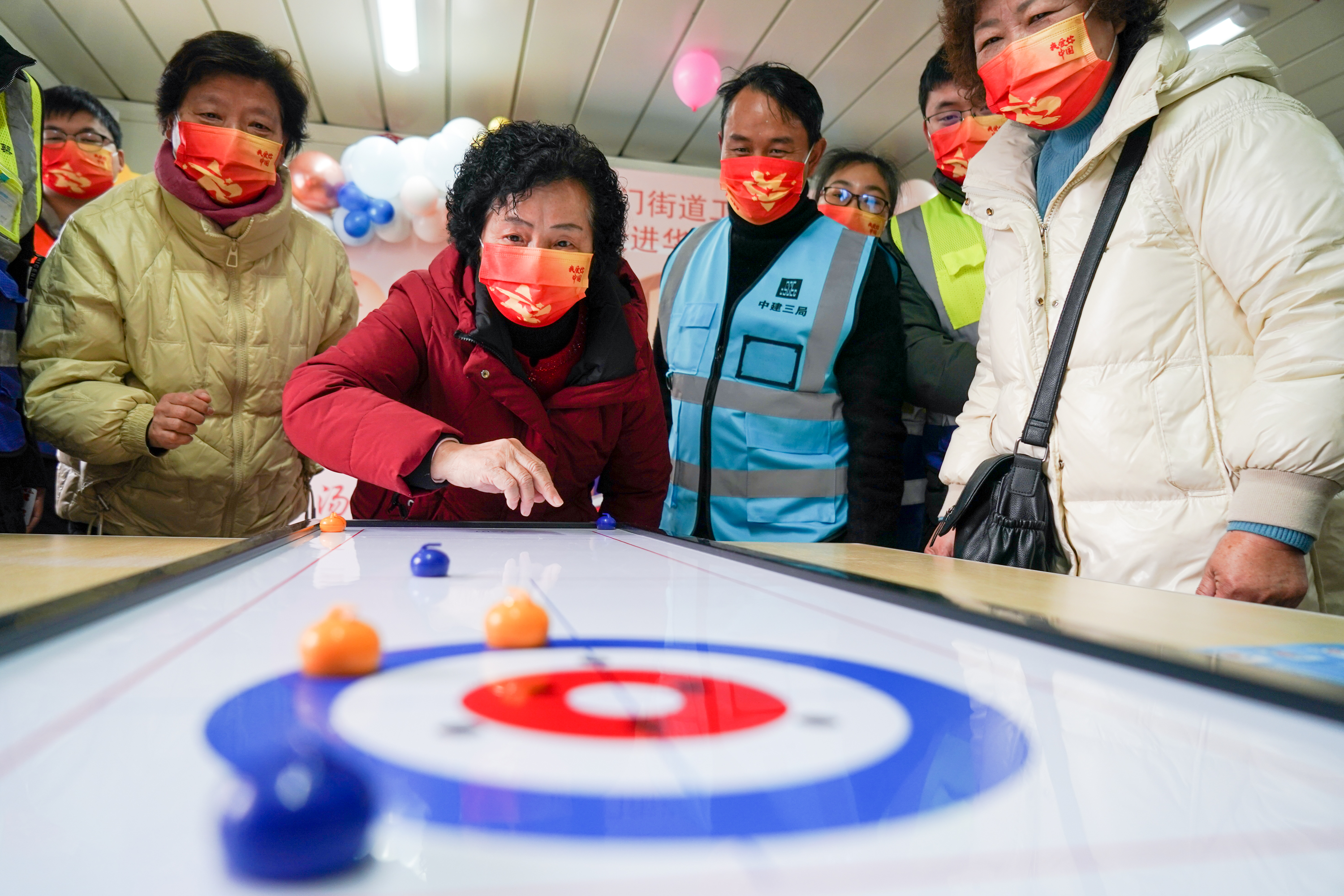 新华社照片,南京,2022年2月14日 热热闹闹迎元宵 2月14日,在中建三局三公司南京华茂中心项目工人生活区,工人们和南京市鼓楼区工人新村社区的居民进行桌上冰壶比赛。 元宵佳节将至,各地群众通过丰富多彩的活动热热闹闹迎元宵。 新华社记者李博摄
