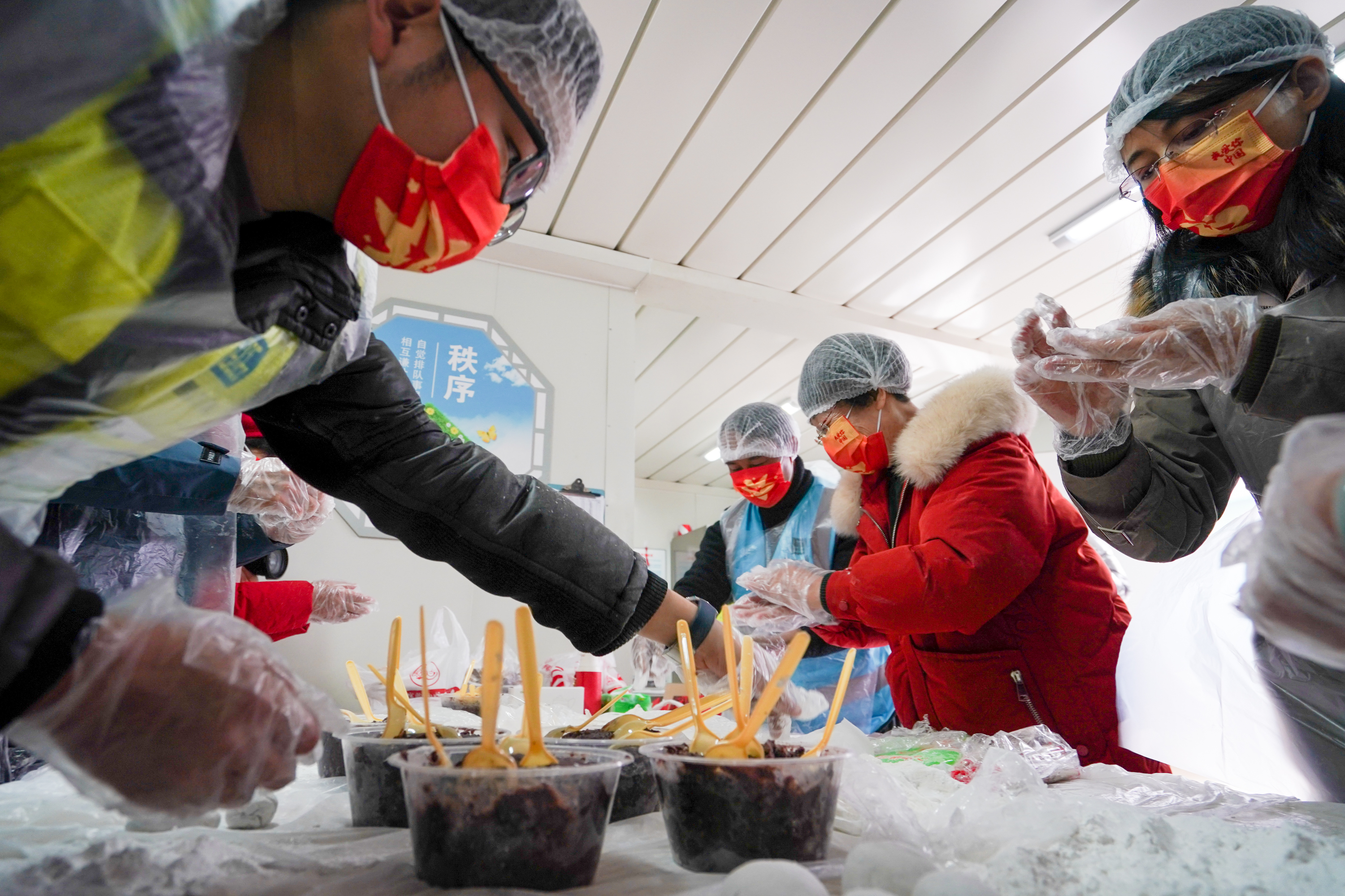 新华社照片,南京,2022年2月14日 热热闹闹迎元宵 2月14日,在中建三局三公司南京华茂中心项目工人生活区,工人们和南京市鼓楼区工人新村社区的居民一起制作汤圆。 元宵佳节将至,各地群众通过丰富多彩的活动热热闹闹迎元宵。 新华社记者李博摄