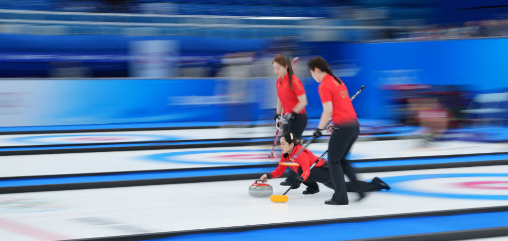 2月14日,中国队选手王芮(中)在女子冰壶循环赛中。新华社记者周密摄