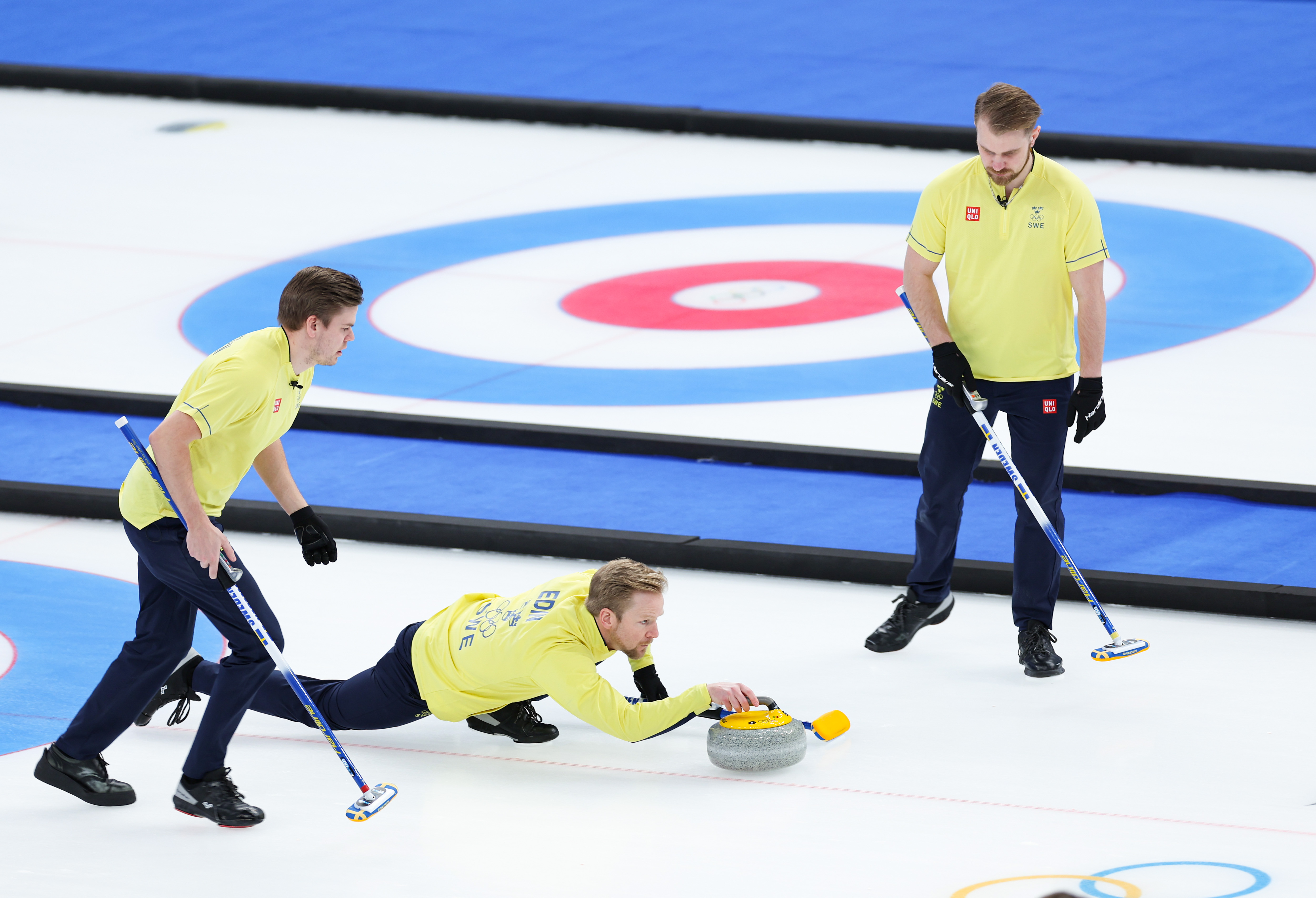 2月14日,瑞典队选手在北京冬奥会男子冰壶循环赛中。新华社记者王婧嫱摄