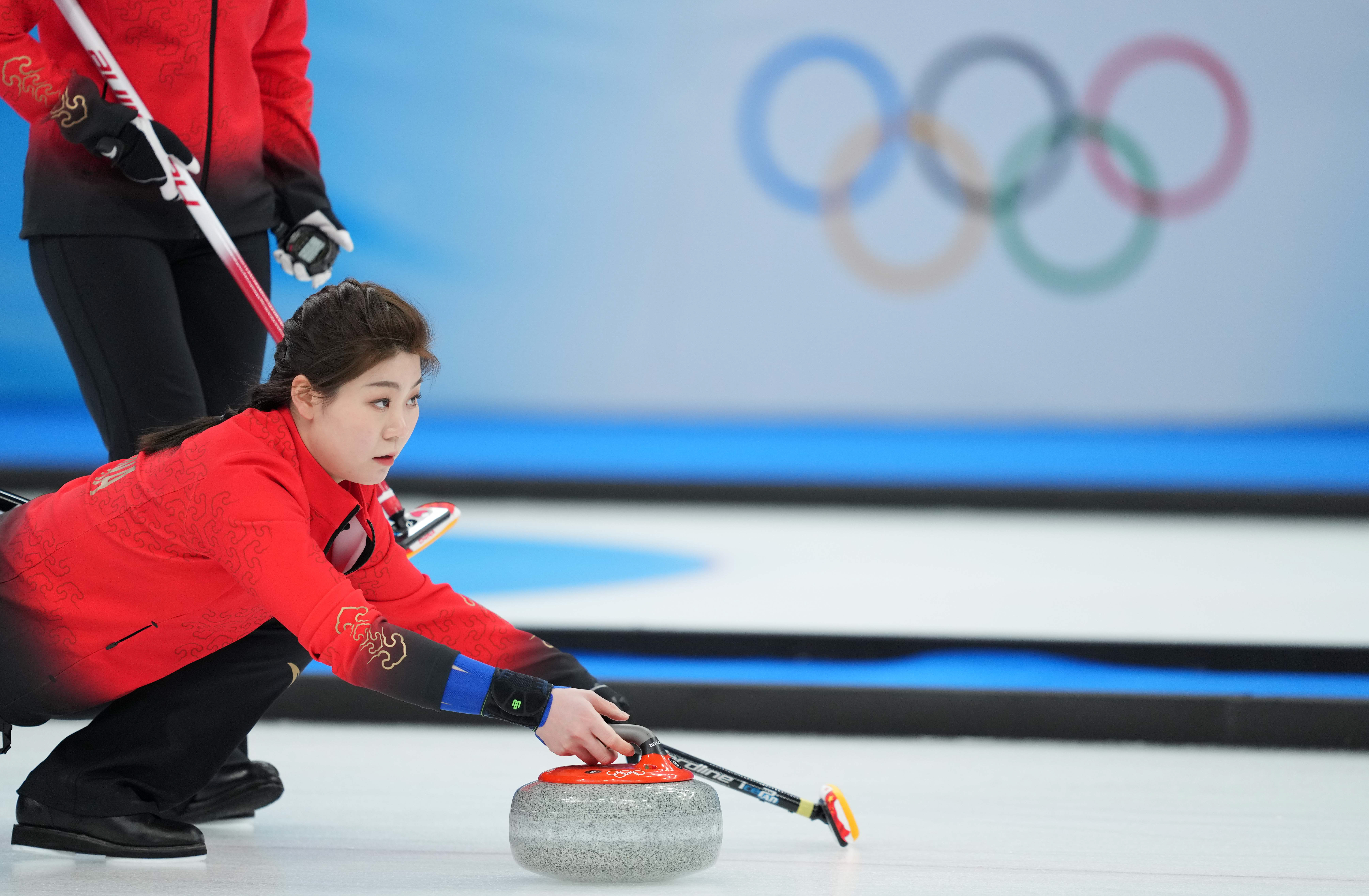 2月14日,中国队选手董子齐在北京冬奥会女子冰壶循环赛中。新华社记者周密摄