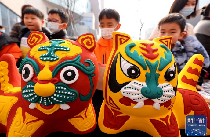 在山东枣庄市民中心“非遗闹元宵”活动上,小朋友在观看山东省级非遗项目“枣庄泥塑”作品《虎虎生威》。