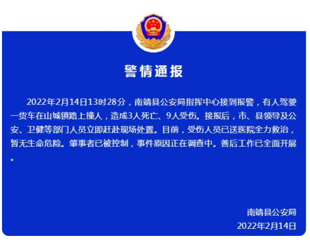 ·福建南靖警方通报“货车连撞多人”:3人遇难9人受伤,肇事者已被控制。