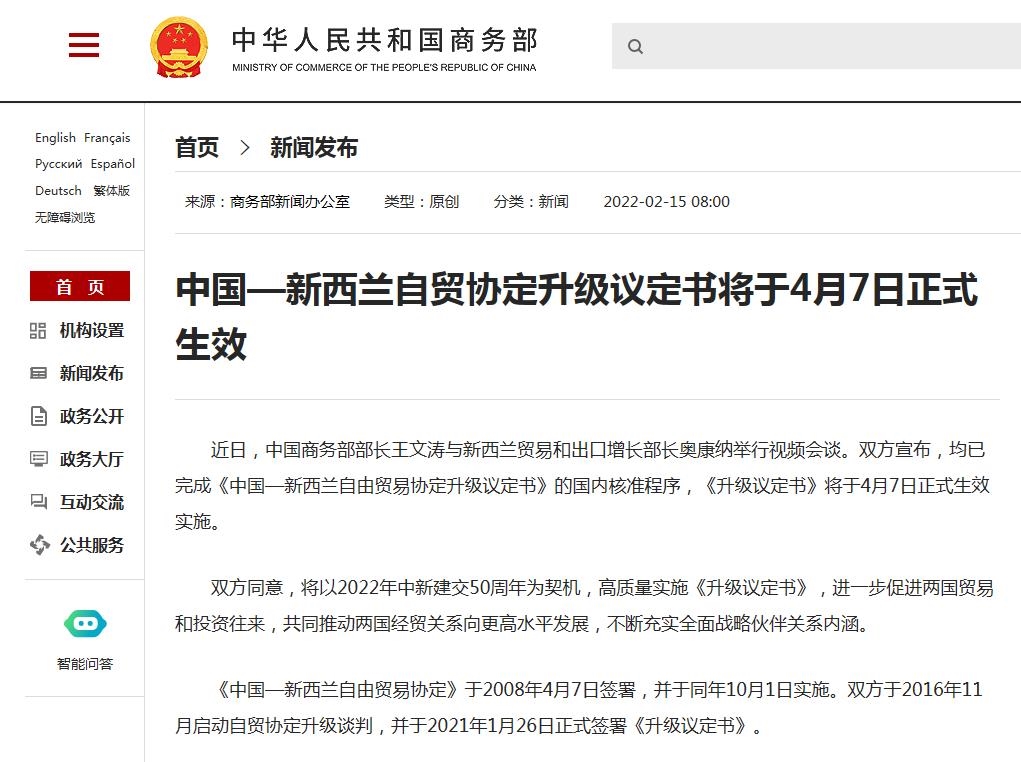 近日,中国商务部部长王文涛与新西兰贸易和出口增长部长奥康纳举行视频会谈。双方宣布,均已完成《中国—新西兰自由贸易协定升级议定书》的国内核准程序,《升级议定书》将于4月7日正式生效实施。