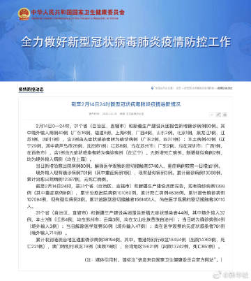 截至2月14日24时,据31个省(自治区、直辖市)和新疆生产建设兵团报告,现有确诊病例1398例(其中重症病例6例),累计治愈出院病例101060例,累计死亡病例4636例,累计报告确诊病例107094例,现有疑似病例3例。累计追踪到密切接触者1561451人,尚在医学观察的密切接触者30116人。