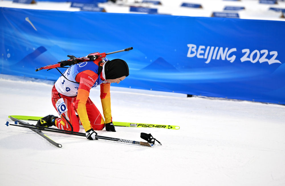 ↑2月8日,中国选手程方明冲过终点后倒地休息。程方明获得第69名。当日,北京2022年冬奥会冬季两项男子20公里个人赛在国家冬季两项中心举行。新华社记者 郭程 摄