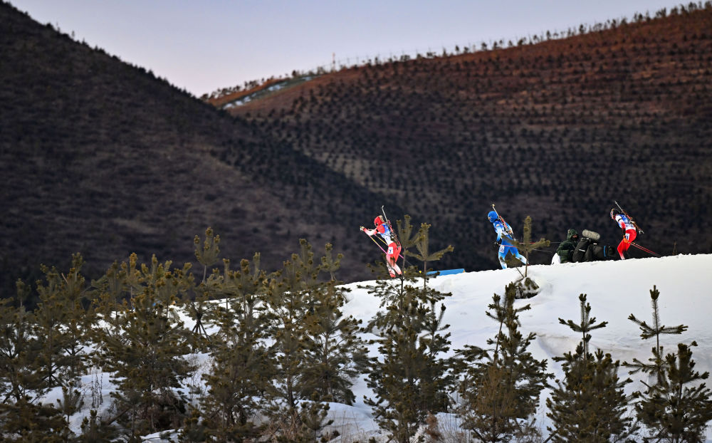 ↑2月7日,参赛选手们在比赛中。当日,北京2022年冬奥会冬季两项女子15公里个人赛在国家冬季两项中心举行。新华社记者 郭程 摄