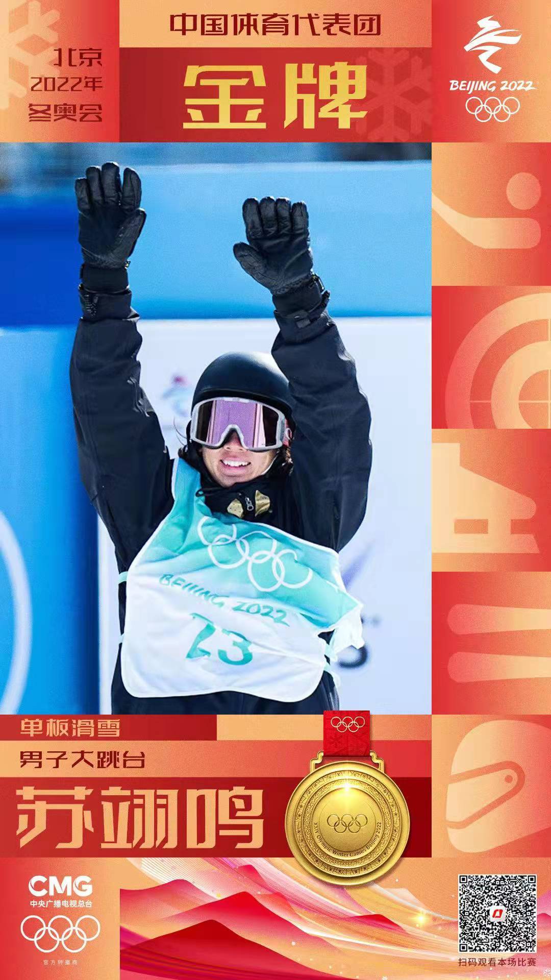 北京冬奥会单板滑雪男子大跳台比赛,中国选手苏翊鸣夺得金牌。这是中国代表团在该项目上夺得的首枚冬奥会金牌!