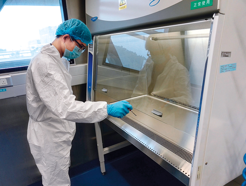 工程师在武汉P4实验室测试设备(资料照片) 摄影/本刊