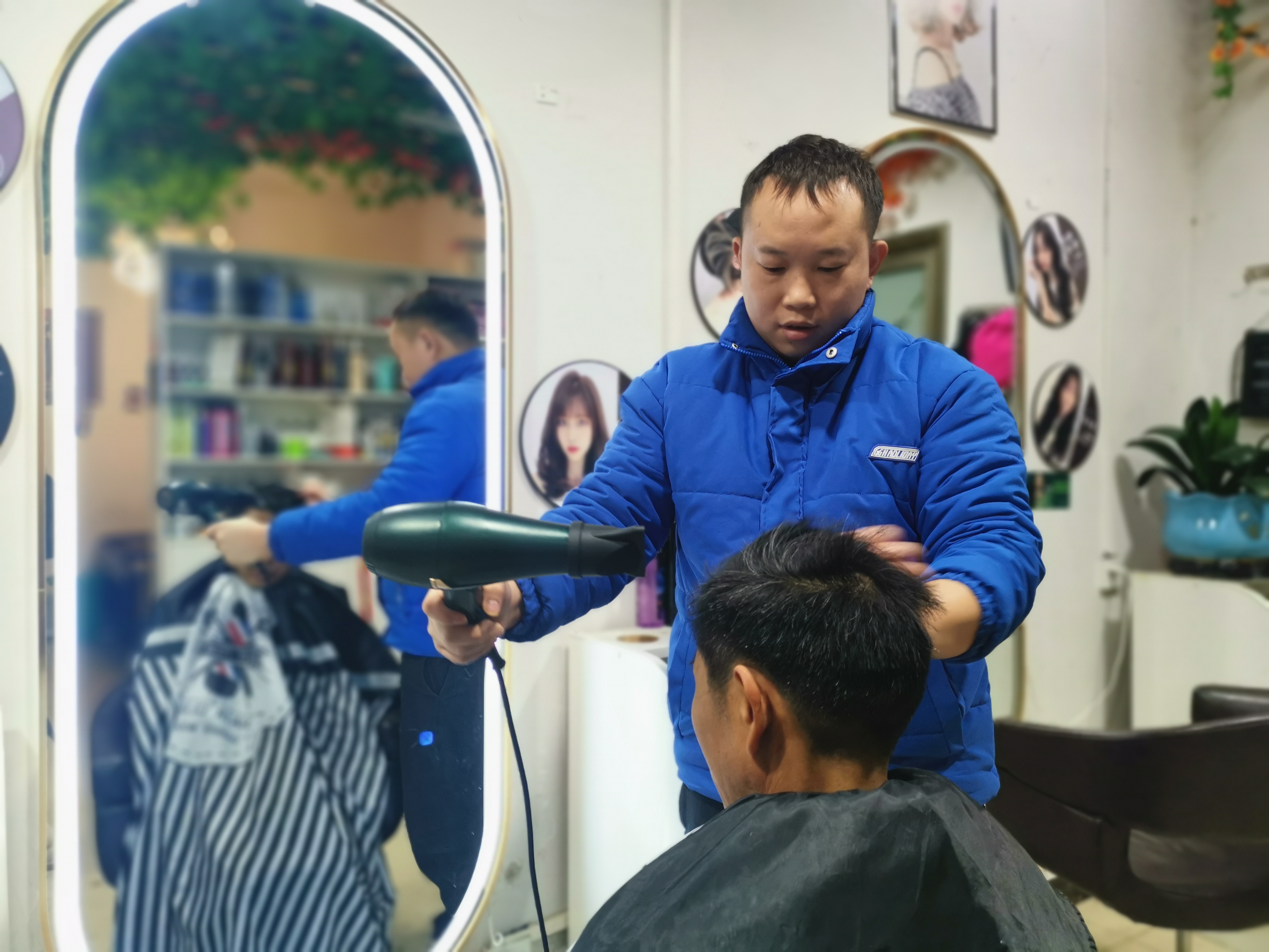梳子和剪刀配合得行云流水,吹风机下翻飞的手指理出柔顺的头发,安东尼目不转睛。新老朋友正月相会,他们不时摆摆龙门阵。自2018年开业以来,安东尼的理发店人气一直比较旺。