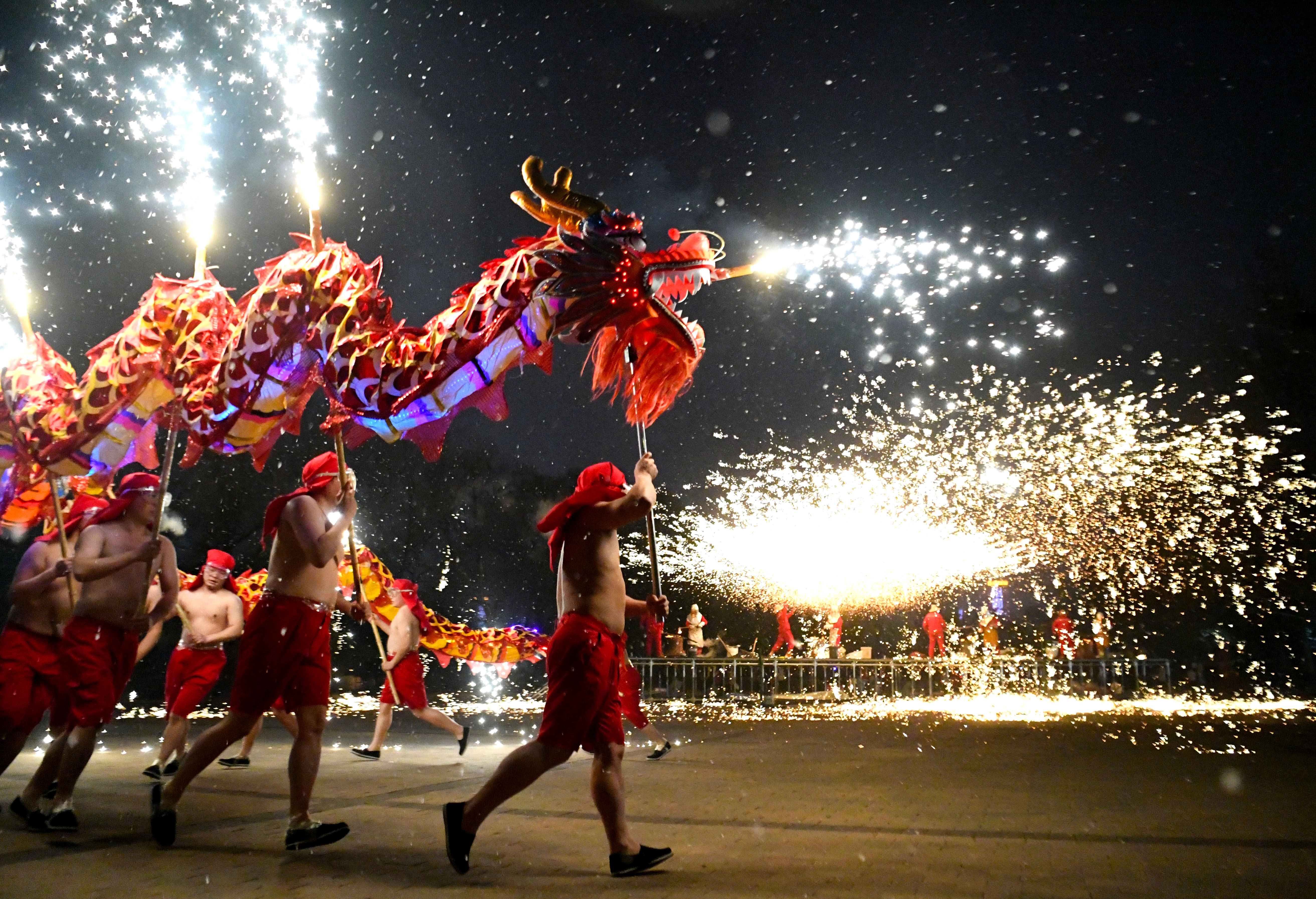 新华社照片,北京,2022年2月15日 花样元宵节 2月14日,在河南省洛阳市洛龙区隋唐城遗址植物园,民俗艺人为市民、游客表演舞龙和“打铁花”,喜迎元宵佳节。 随着元宵节到来,各地举行丰富多彩的活动,热热闹闹庆佳节。 新华社记者 郝源 摄