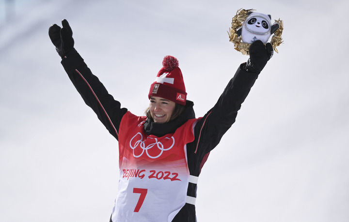 2月15日,瑞士选手玛蒂尔德·格雷莫德在赛后的颁发纪念品仪式上。新华社记者邓华摄