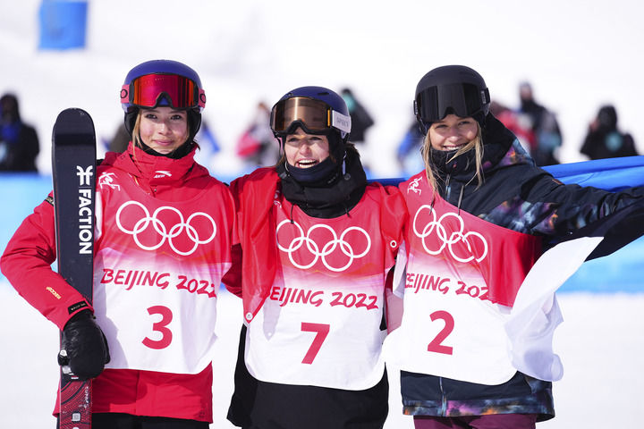 2月15日,冠军瑞士选手玛蒂尔德·格雷莫德(中)、亚军中国选手谷爱凌(左)和季军爱沙尼亚选手凯莉·西尔达鲁在决赛后合影。新华社记者许畅摄
