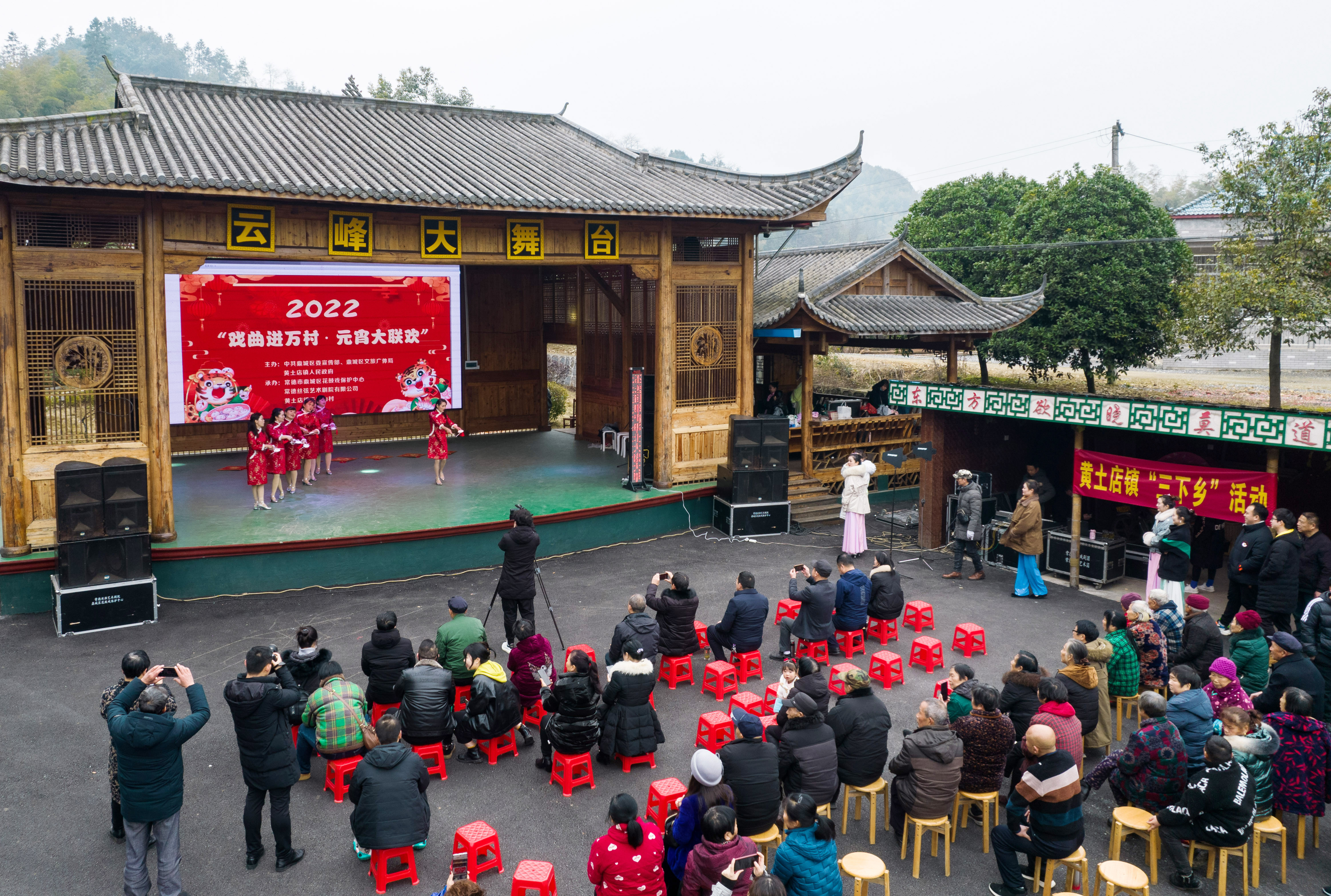 新华社照片,北京,2022年2月15日 花样元宵节 2月15日,湖南省常德市鼎城区花鼓戏保护中心演员在“戏曲进万村·元宵大联欢”送戏下乡活动上演出(无人机照片)。 随着元宵节到来,各地举行丰富多彩的活动,热热闹闹庆佳节。 新华社记者 陈思汗 摄