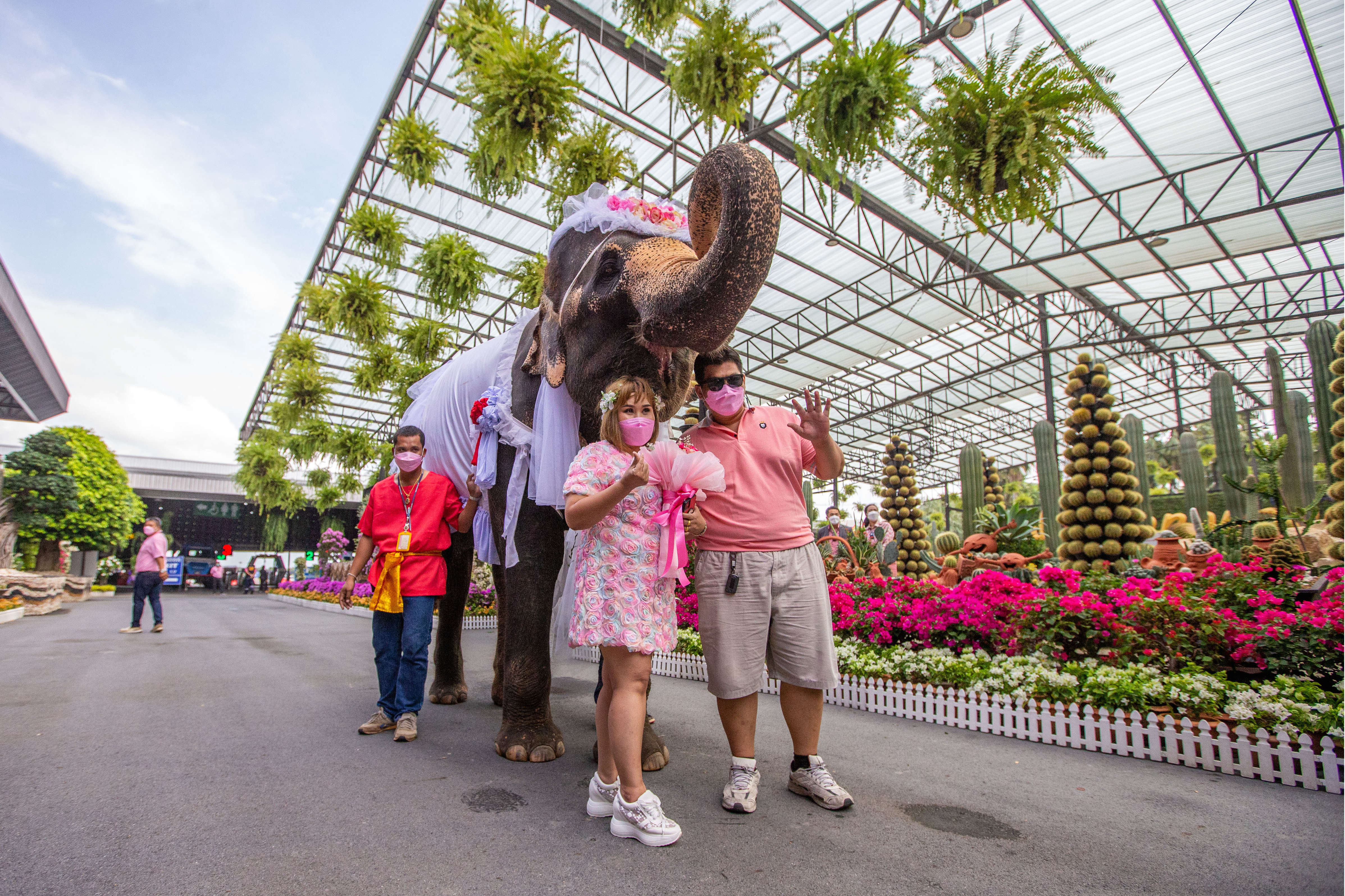 新华社照片,芭提雅(泰国),2022年2月15日 (国际)(7)泰国芭提雅:象背上的婚礼 2月14日,在泰国芭提雅东芭乐园,一对新人与大象合影。 当日,泰国芭提雅东芭乐园为9对新人举行了一场别开生面的“象背婚礼”,祝福他们有情人终成眷属。 新华社记者 王腾 摄