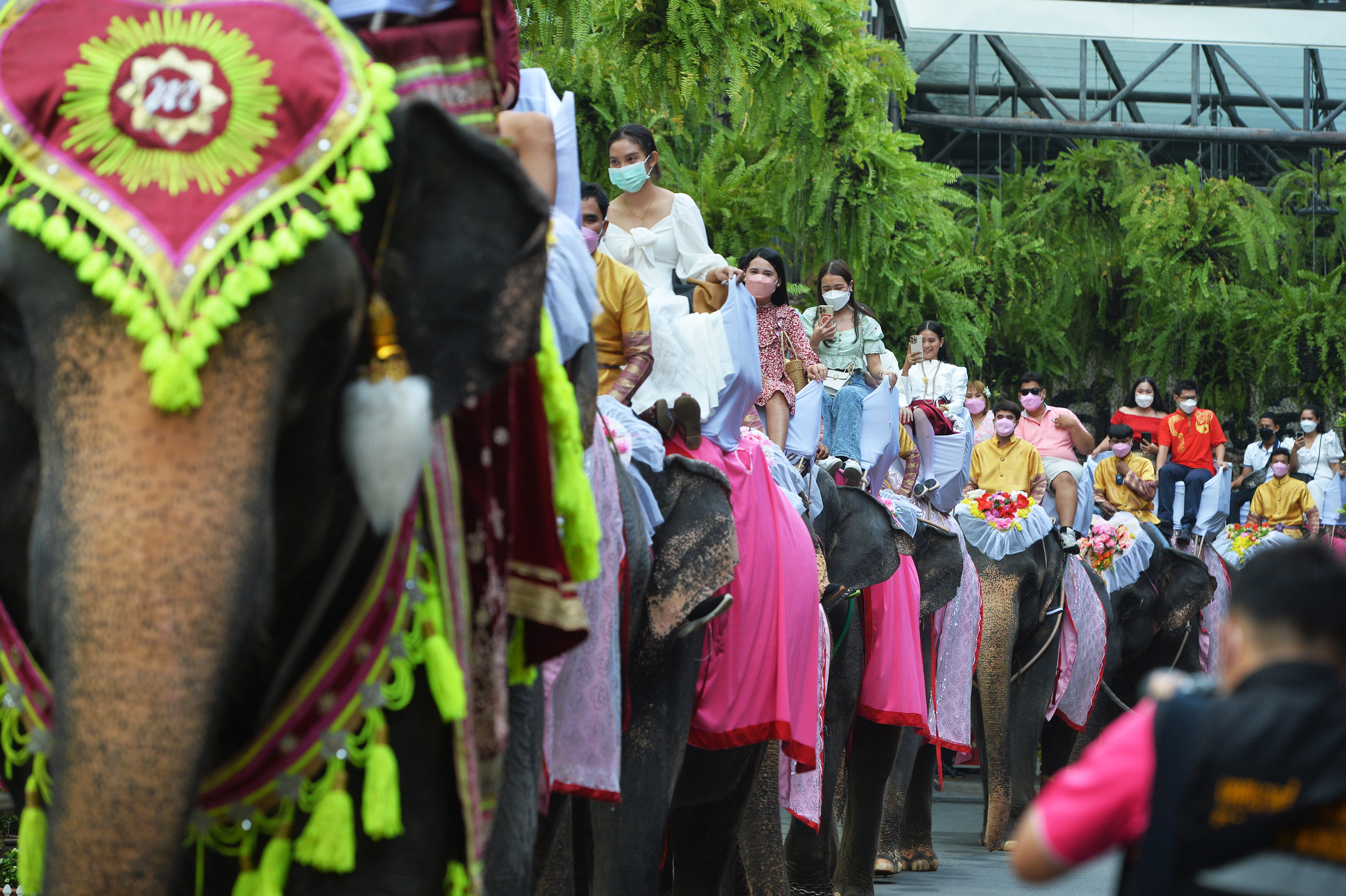 新华社照片,芭提雅(泰国),2022年2月15日 (国际)(4)泰国芭提雅:象背上的婚礼 2月14日,在泰国芭提雅东芭乐园,新人骑乘大象参加婚礼。 当日,泰国芭提雅东芭乐园为9对新人举行了一场别开生面的“象背婚礼”,祝福他们有情人终成眷属。 新华社发(拉亨 摄)