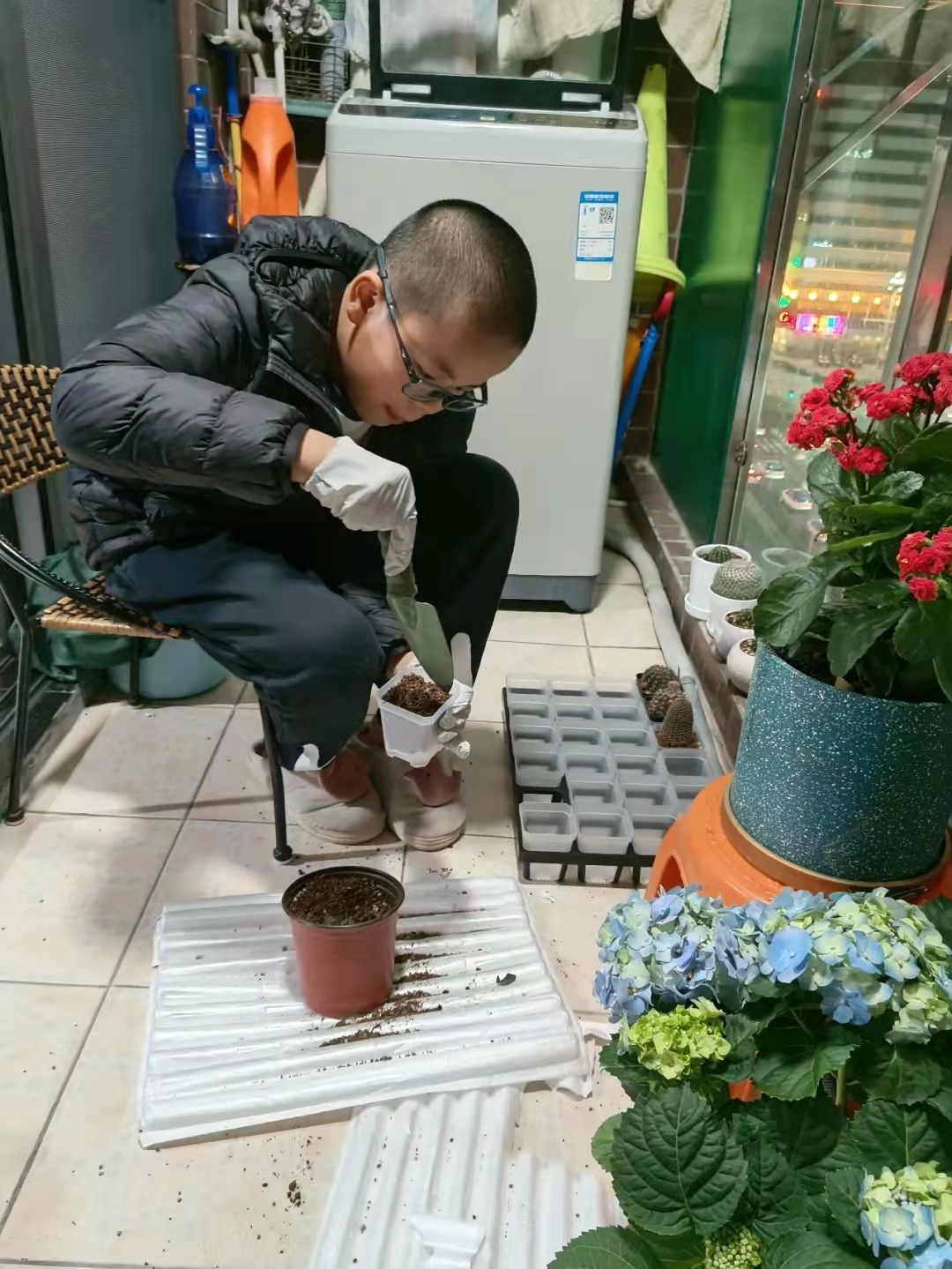 深圳市罗湖区向西小学四年级学生姚浚轩在家中研究绿植。(受访者 供图)