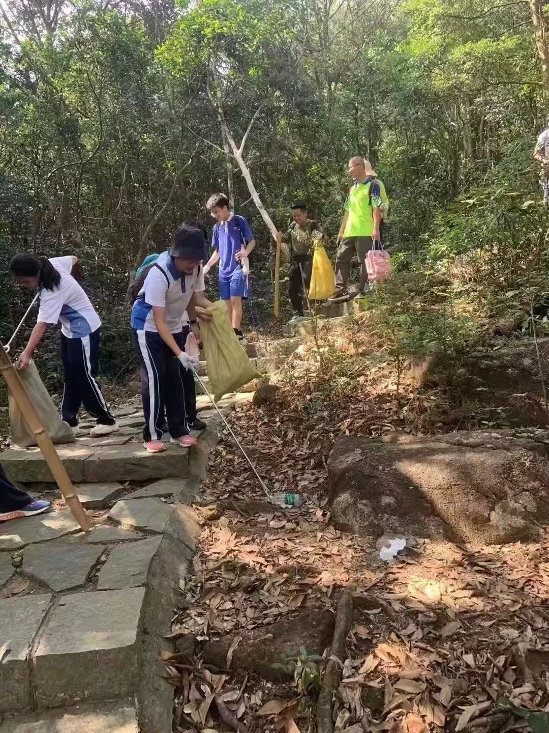 深圳实验学校的学生们在爬山途中捡拾垃圾。(受访者 供图)