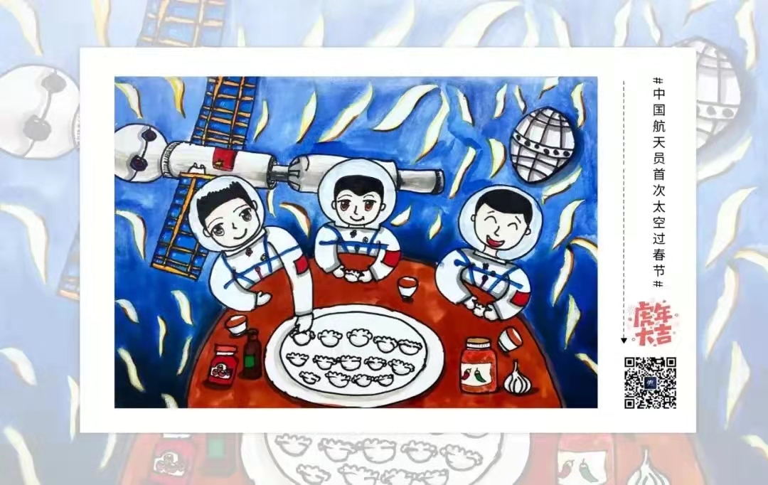 “航天员包饺子、用饺子比心形向全国人民拜年”“航天员在浩瀚宇宙看绚丽烟花”“与航天员在太空捉迷藏”……一幅幅手绘作品脑洞大开、创意十足、活灵活现。孩子们在天马行空的想象中,仿佛都成为空间站的一员,与航天员一起度过难忘的春节。