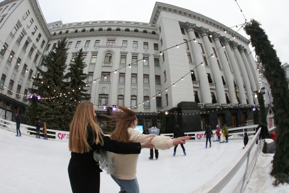 2月10日,在乌克兰基辅的总统办公大楼前,市民在为迎接新年临时搭建的滑冰场上滑冰。(新华社发,谢尔盖·斯塔拉斯坚科摄)