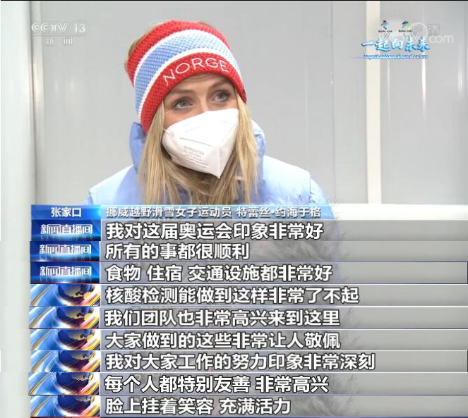 挪威越野滑雪女子运动员 特蕾丝·约海于格:我们的团队因为新冠疫情比原计划晚来了一周,而我在正式比赛(之前)只在雪道上练习了两次。这里有风又很冷,我就是出生在这样环境,我知道如何在这样的环境里比赛。我为了获得一枚单项金牌训练了很久,付出了很多,这是我职业生涯最重要的一天。