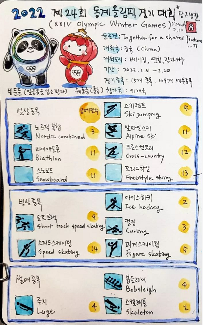 2月10日,一位教授中文的韩国老师,用心手绘了一份北京冬奥会观赛指南,用韩英双语详细介绍了冬奥会的口号、地点、比赛项目、奖牌数等,并在最显眼的位置画出冰墩墩和雪容融的卡通形象。一位网友留言送上鼓掌的表情,并称赞道,“托你的福,我正在学习了解冬奥会。”(海外网 刘强)