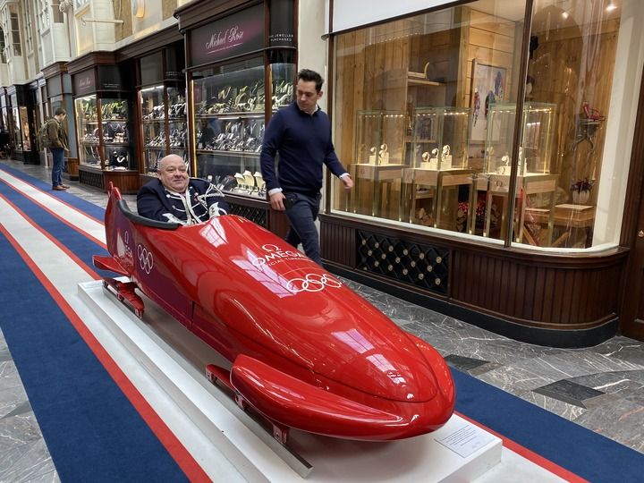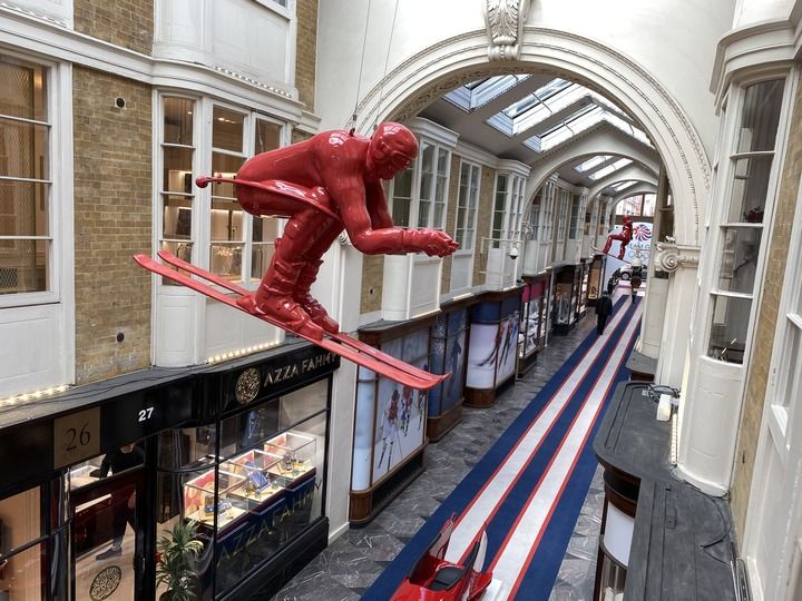 伯灵顿拱廊街拥有两百年历史,特意将约180米的购物长廊打造成一条长长的冰雪“赛道”。沿着“赛道”而行,滑雪“运动员”迎面而来,“冰车”疾驰而过,还有“运动员”腾空掠过头顶——这些冬奥装置选用喜庆的大红色。