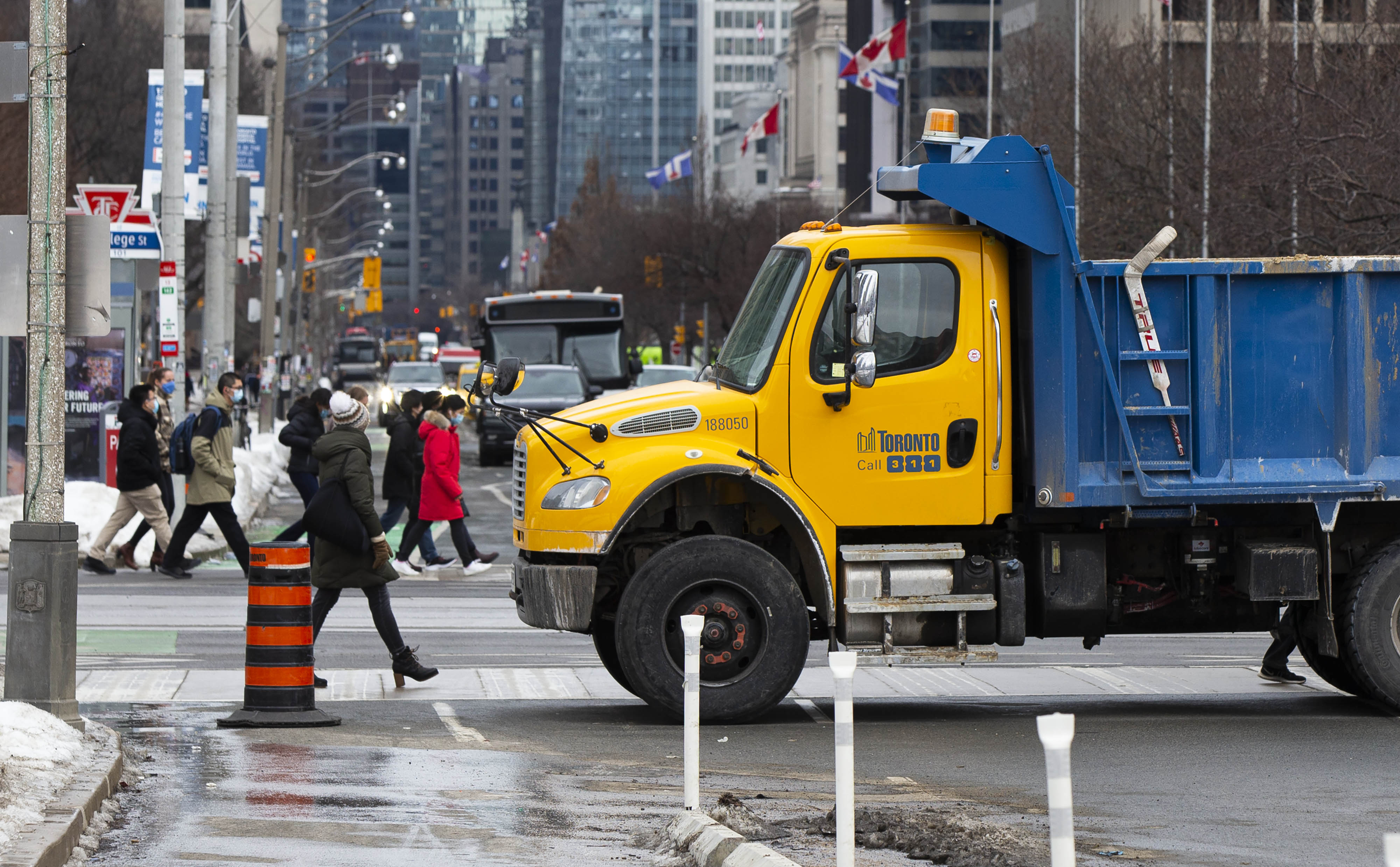 2月11日,在加拿大安大略省多伦多市,警方调动市政卡车封锁了安大略省议会大厦前的街道。由于卡车司机抗议示威活动在该省蔓延,对经济造成重大影响,安大略省已经进入紧急状态。(新华社发,邹峥摄)