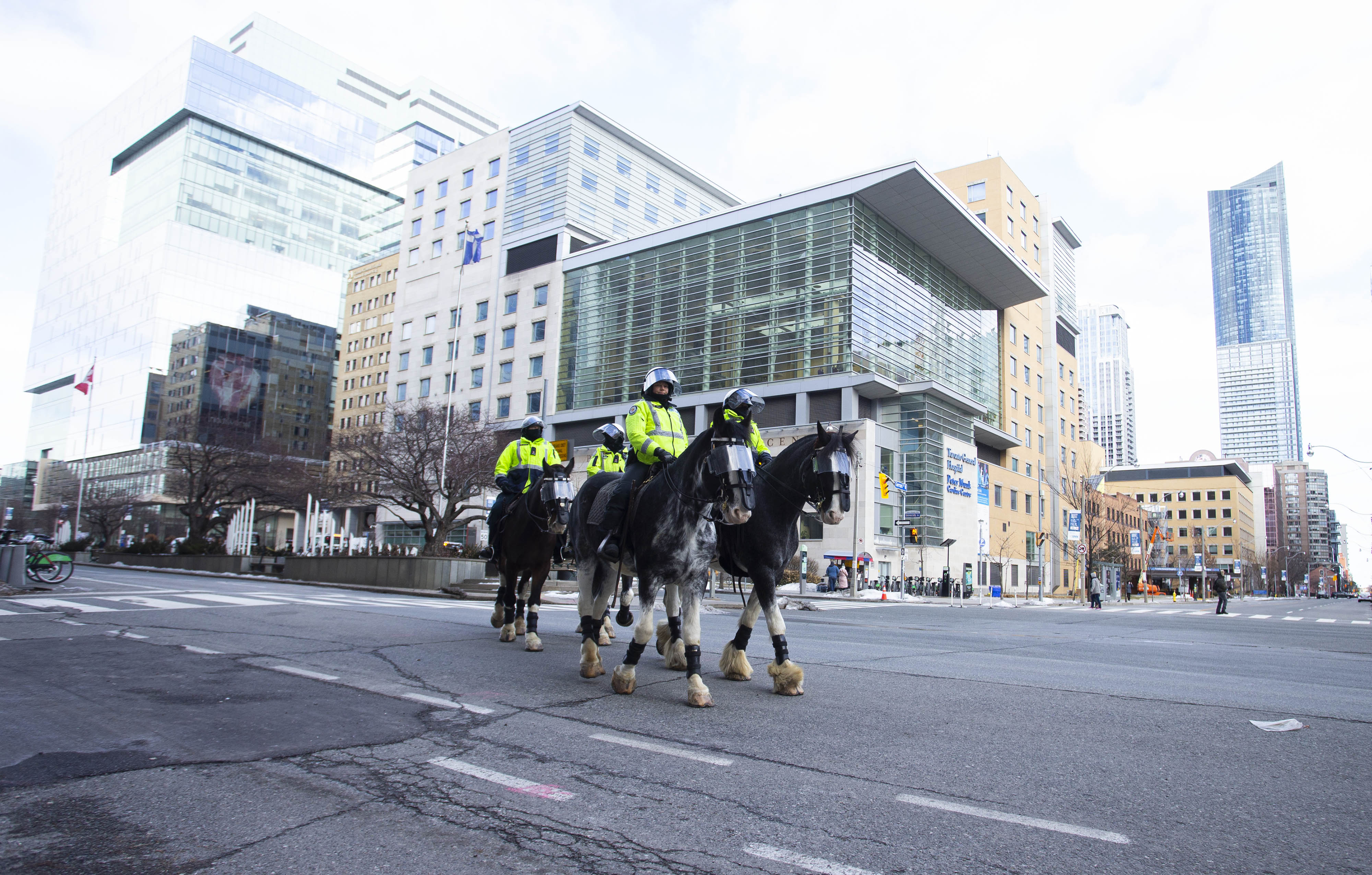 2月12日,在加拿大多伦多,骑警在一条被封锁的街道上巡逻。(新华社发,邹峥摄)