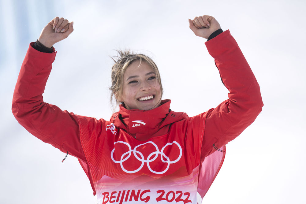 2月15日,谷爱凌在颁发纪念品仪式上。新华社记者肖艺九摄