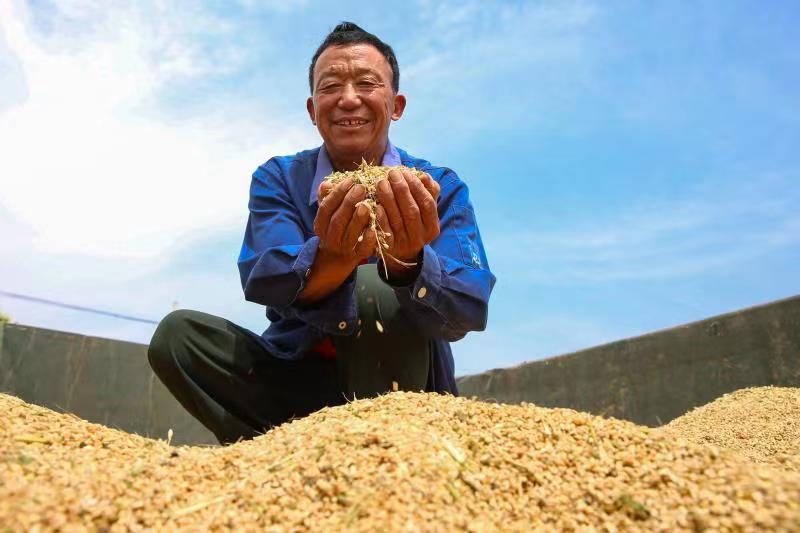 2021年5月27日,湖北襄阳枣阳市吴店镇肖湾村,丰收时节,农户查看刚刚收割的小麦。图片由受访者提供