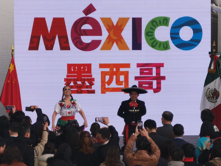 图为两位墨西哥舞蹈演员在上海为中墨建交50周年庆祝活动起舞。新华社记者吴宇摄