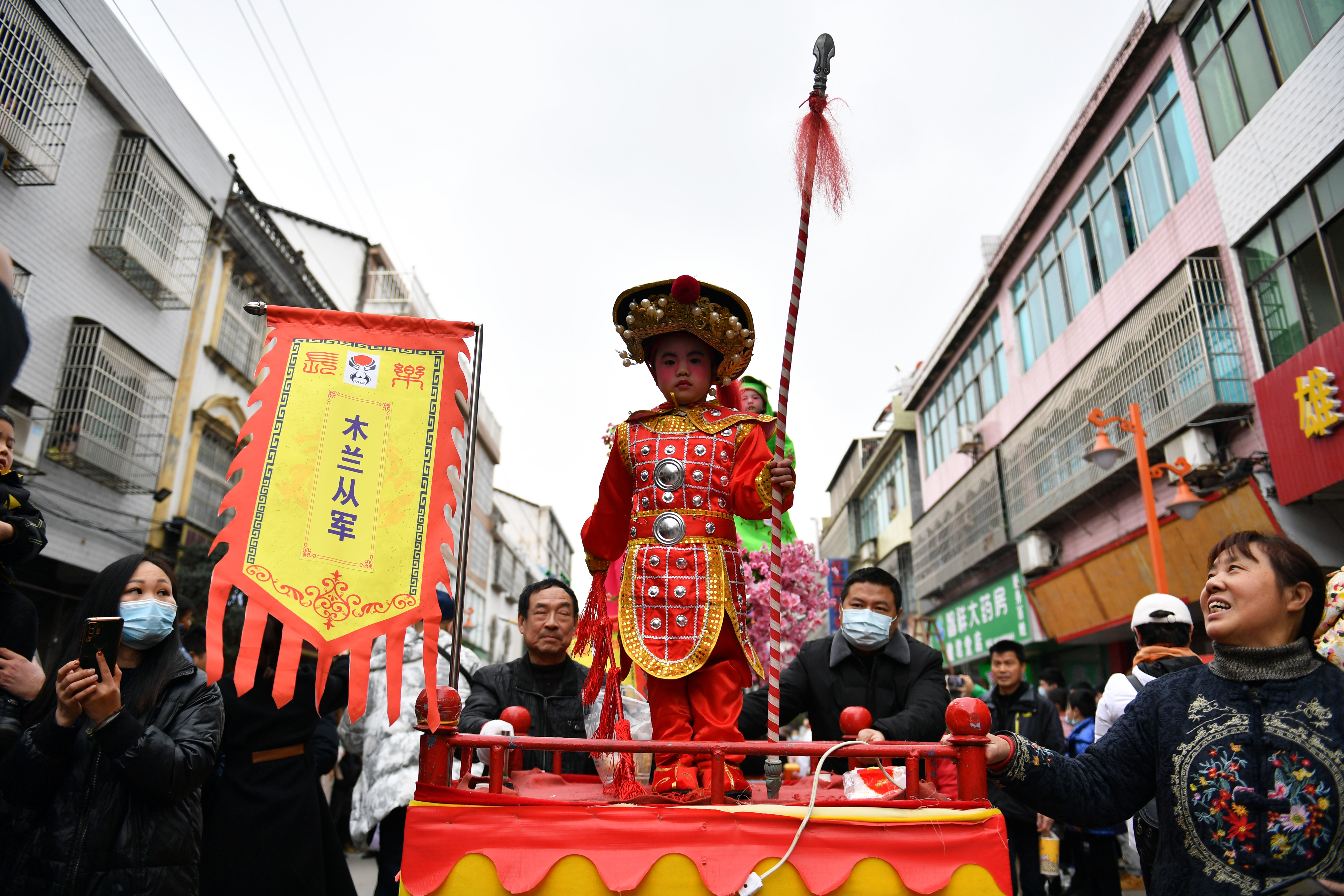 新华社照片,长沙,2022年2月15日 千年元宵节民俗“长乐抬阁故事会”的新传承 2月15日,小朋友们在汨罗市长乐镇参加“抬阁故事会”。 (配本社同题文字稿) 新华社记者 陈振海 摄
