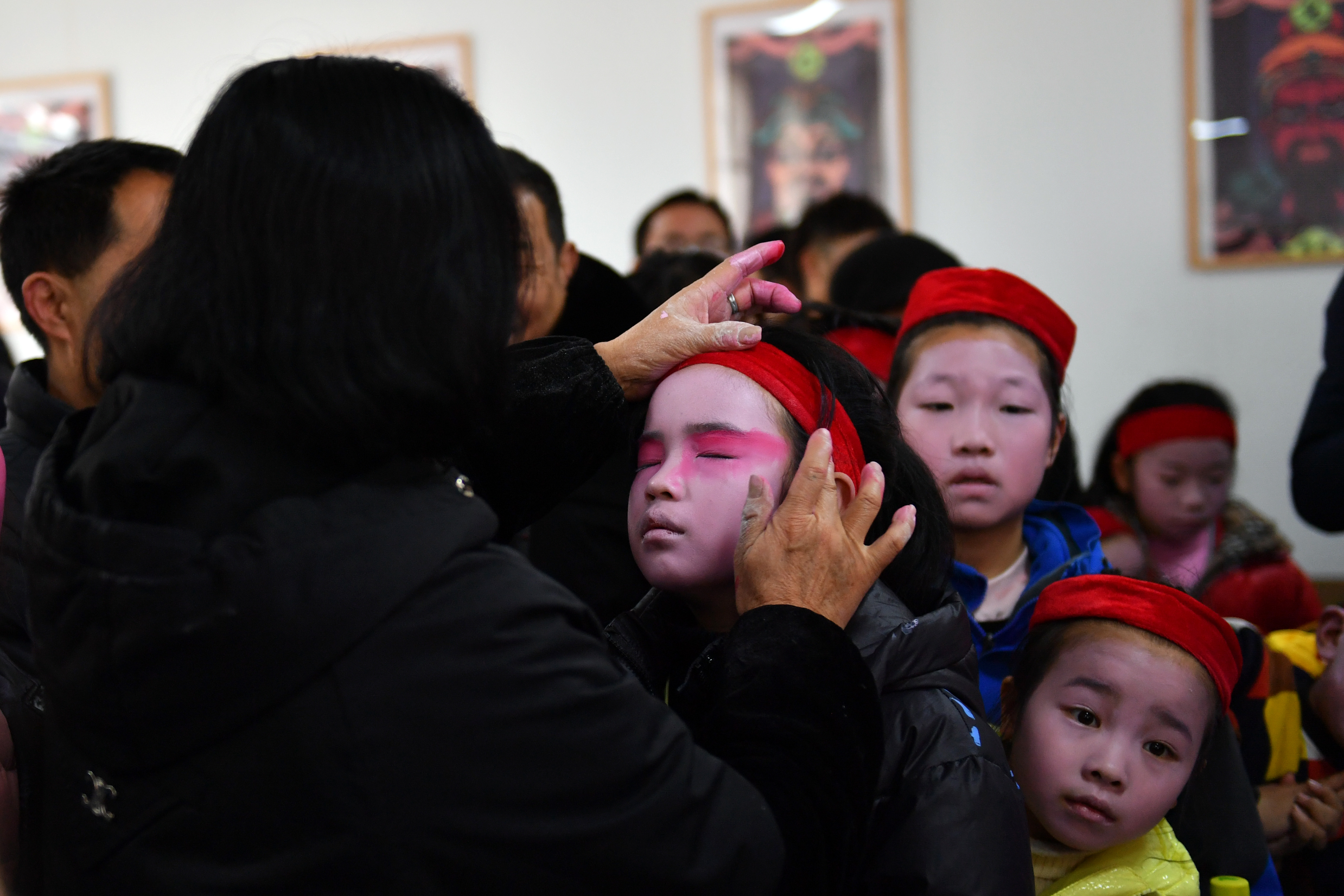 新华社照片,长沙,2022年2月15日 千年元宵节民俗“长乐抬阁故事会”的新传承 2月15日,在汨罗市长乐镇,小朋友们在参加“抬阁故事会”前化装。 (配本社同题文字稿) 新华社记者 陈振海 摄