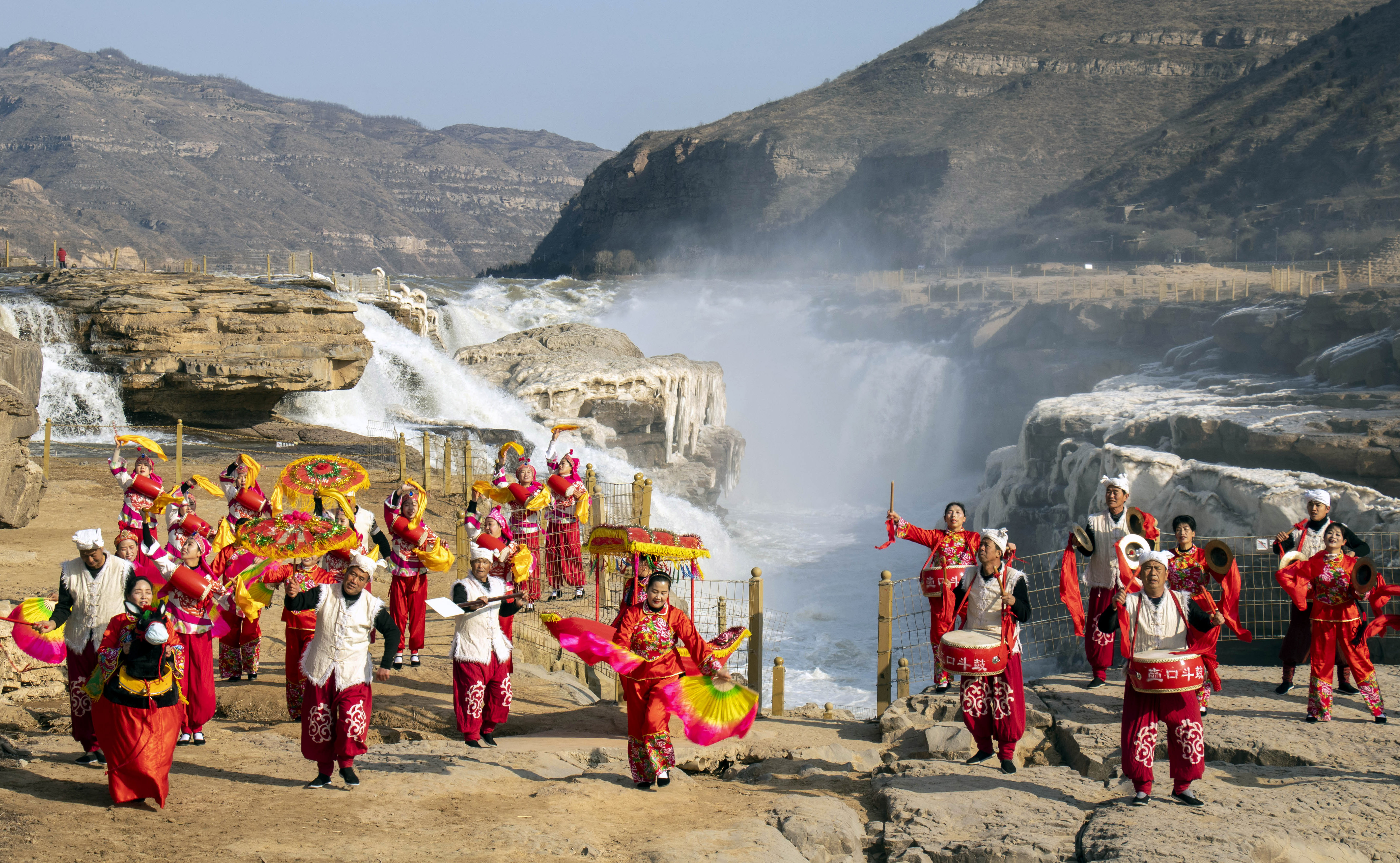 新华社照片,延安(陕西),2022年2月15日 花样元宵节 2月15日,民俗艺人在陕西壶口瀑布景区进行民俗表演。 随着元宵节到来,各地举行丰富多彩的活动,热热闹闹庆佳节。 新华社发(夏学超 摄)