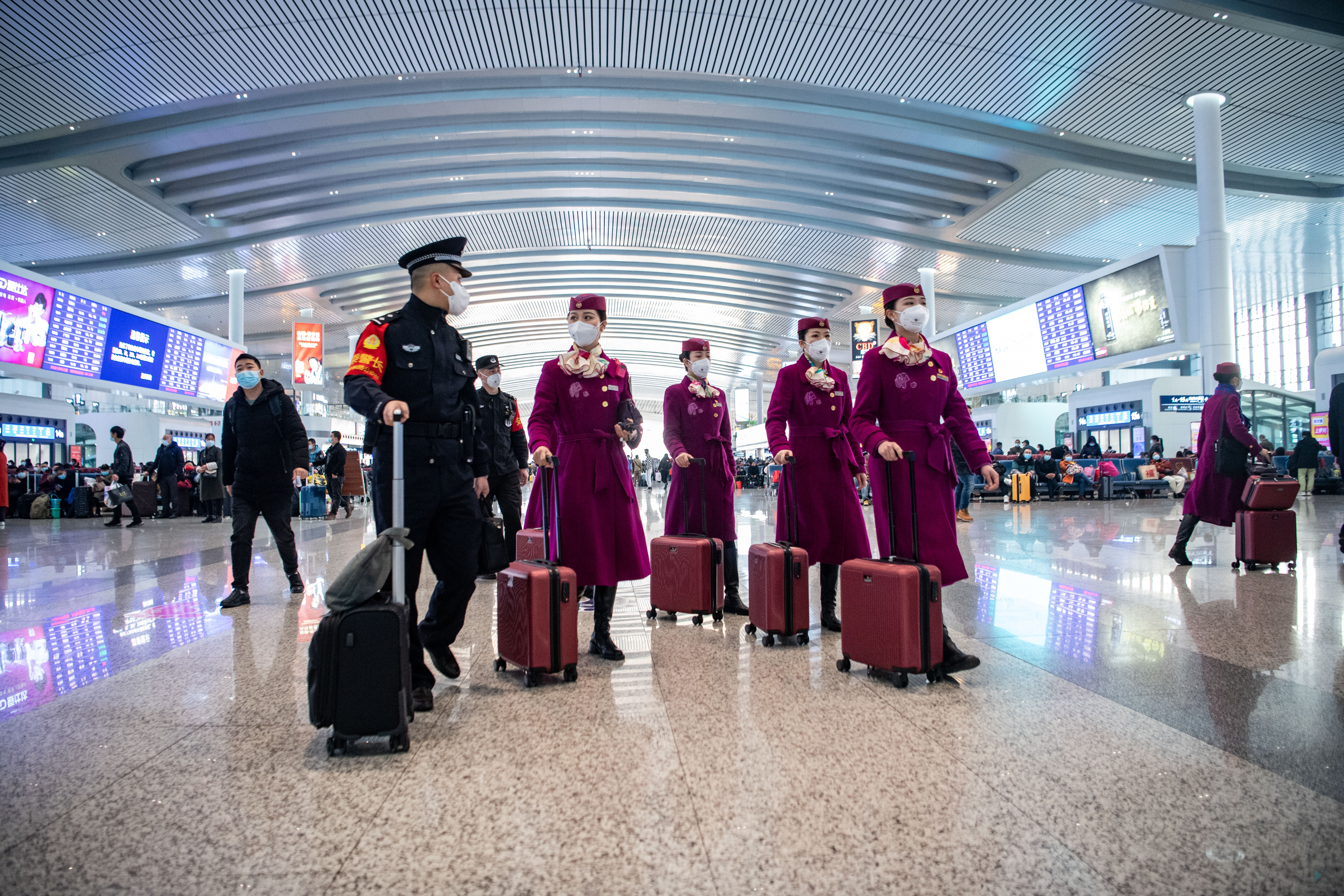 新华社照片,重庆,2022年2月15日 相反的方向 相同的心 2月15日,在重庆西站候车厅,祁悦(左一)与妻子周幸一同前往站台。 祁悦是重庆铁路公安处乘警支队的一名四级警长,妻子周幸是成渝复兴号动车组的一名列车长。 元宵节清晨,祁悦和妻子周幸都在重庆西站上了火车,但这并非是回家的旅程。祁悦向南,值乘开往昆明南的G2873次动车;周幸向北,值乘开往成都的G8692次复兴号列车。元宵佳节,夫妻二人带着对家人的牵挂,向相反的方向出发,与旅客相伴。 新华社记者 唐奕 摄