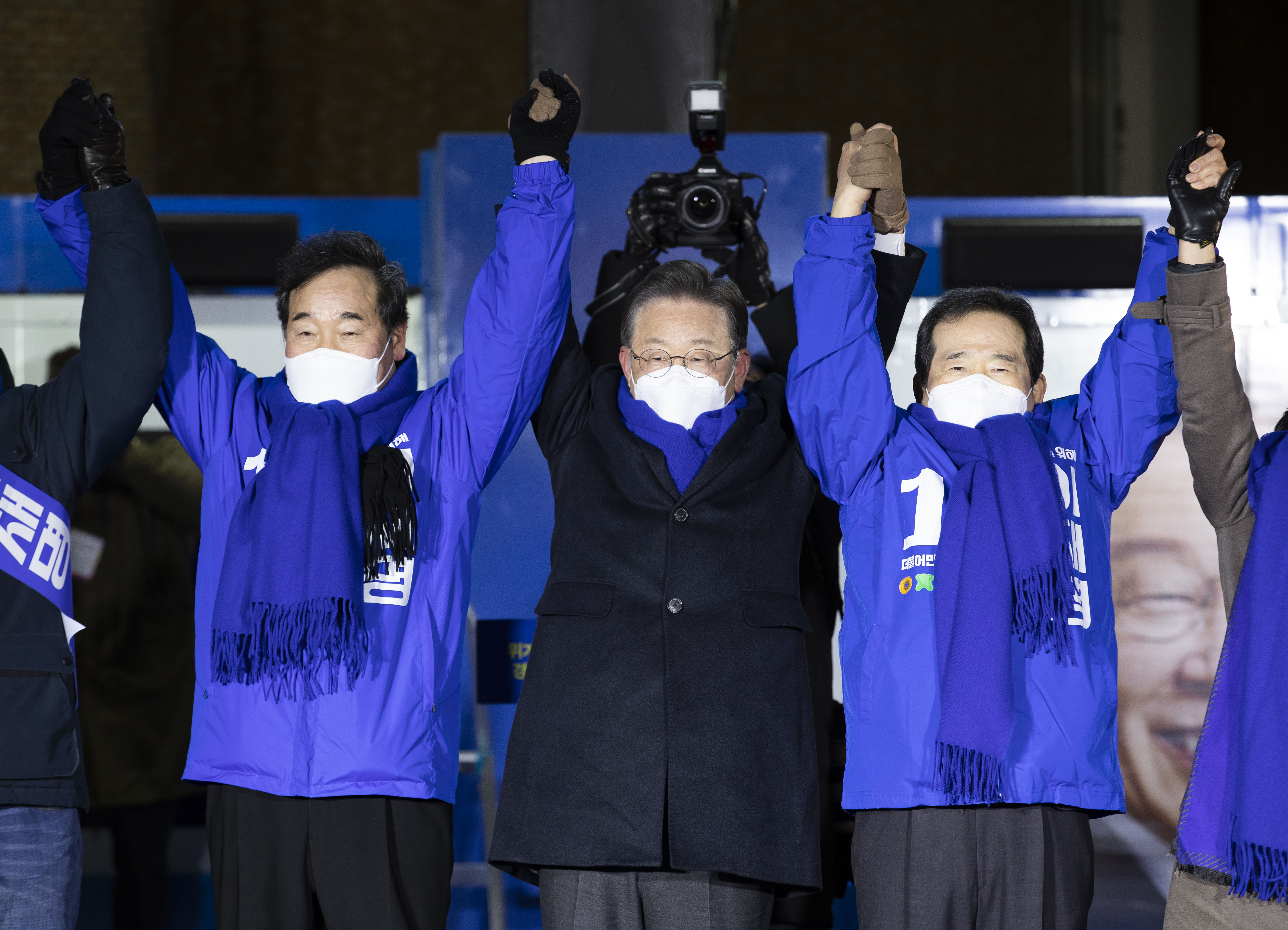 新华社照片,首尔,2022年2月15日 (国际)(1)韩国大选竞选活动拉开帷幕 2月15日,候选人李在明(中)在韩国首尔参加竞选活动。 韩国第20届总统选举定于3月9日举行,2月13日至14日为总统候选人登记时间,正式竞选活动于15日开始。 新华社发(李相浩摄)