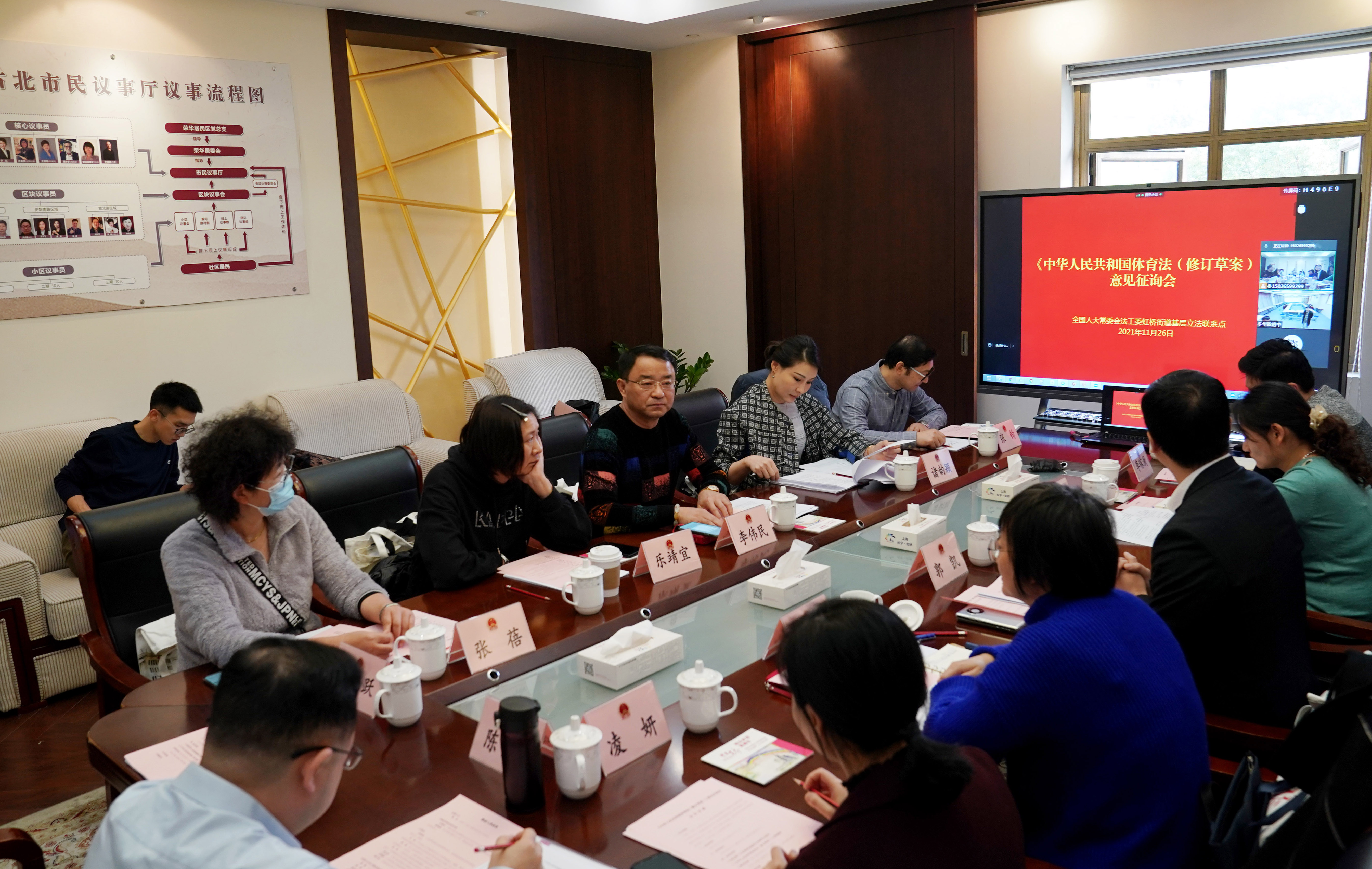新华社照片,北京,2022年2月15日 “人民对美好生活的向往,就是我们的奋斗目标”——“十个明确”彰显马克思主义中国化新飞跃述评之三 上海长宁区虹桥街道基层立法联系点召开《中华人民共和国体育法(修订草案)》意见征询座谈会(2021年11月26日摄)。 (配本社同题文字稿) 新华社记者 刘颖 摄