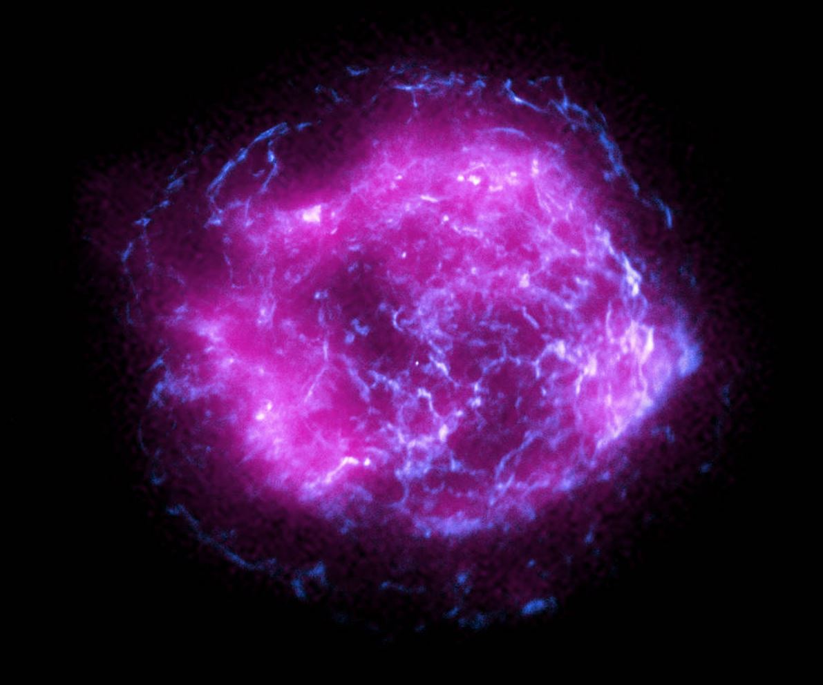 该“仙后座A”图像结合了IXPE收集的第一批X射线数据(紫红色)和钱德拉X射线天文台收集的高能X射线数据(蓝色)